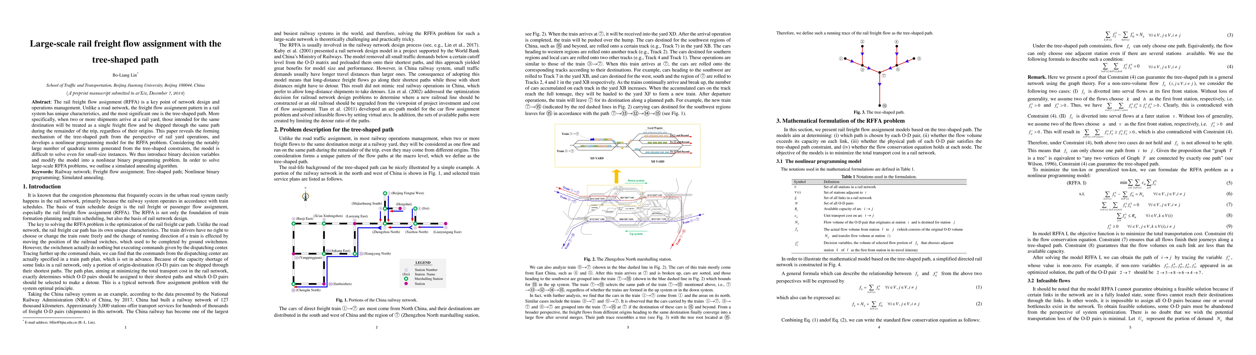 This paper develops a nonlinear programming model for large-scale rail freight flow assignment with tree-shaped paths, addressing the unique characteristics of rail systems. To tackle the computational challenges, it transforms the model into a nonlinear binary programming problem and proposes a simulated annealing algorithm for efficient large-scale solution.