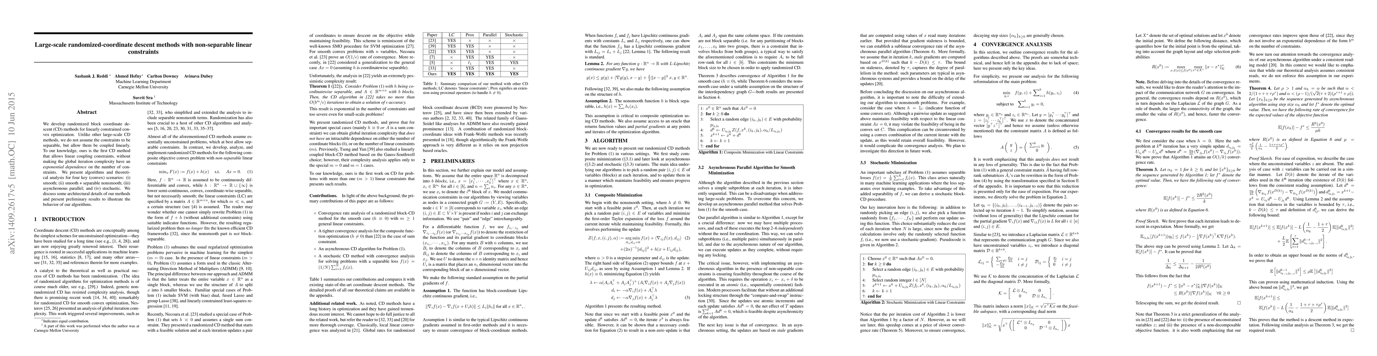 This paper introduces randomized coordinate descent methods for non-separable linearly constrained convex optimization, presenting algorithms that avoid exponential complexity growth with the number of constraints. It covers smooth, mixed, parallel, and stochastic scenarios, and validates the approach through simulation experiments.