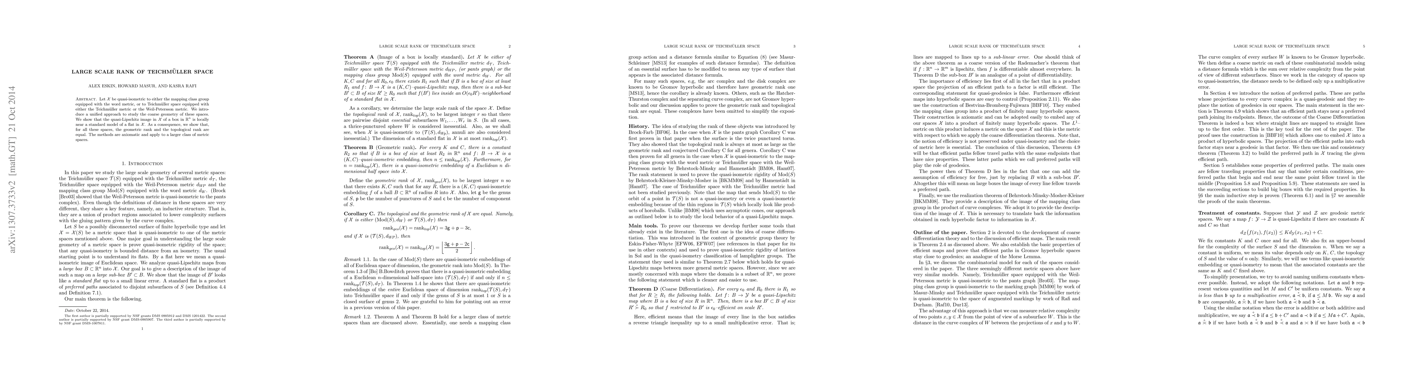 Let X be quasi-isometric to either the mapping class group equipped with the word metric, or to Teichmuller space equipped with either the Teichmuller metric or the Weil-Petersson metric. We introduce a unified approach to study the coarse geometry of these spaces. We show that the quasi-Lipschitz image in X of a box in R^n is locally near a standard model of a flat in X. As a consequence, we show that, for all these spaces, the geometric rank and the topological rank are equal. The methods are axiomatic and apply to a larger class of metric spaces.