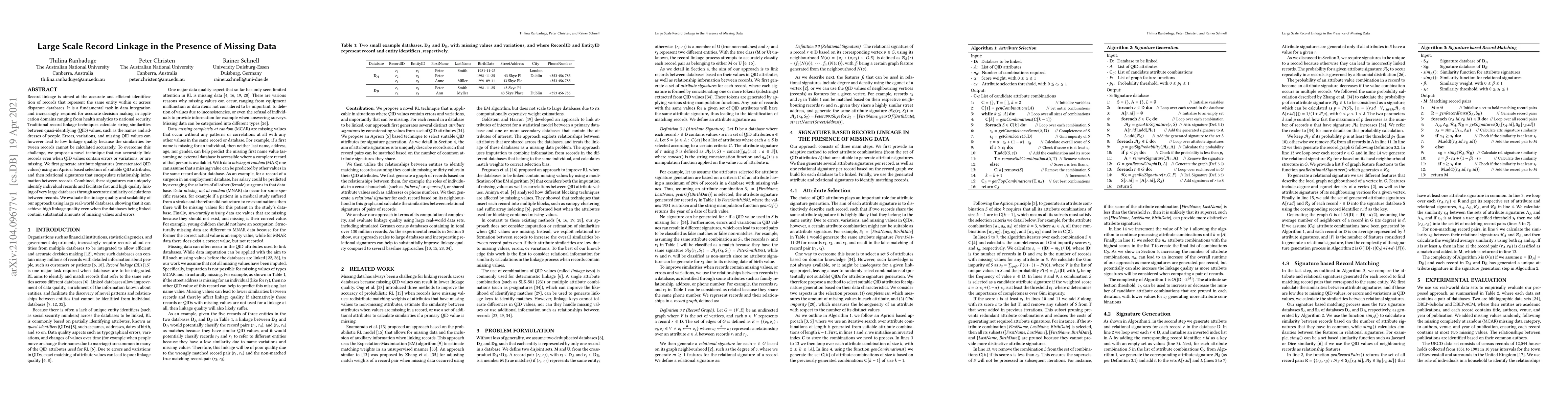 Record linkage is aimed at the accurate and efficient identification of records that represent the same entity within or across disparate databases. It is a fundamental task in data integration and increasingly required for accurate decision making in application domains ranging from health analytics to national security. Traditional record linkage techniques calculate string similarities between quasi-identifying (QID) values, such as the names and addresses of people. Errors, variations, and missing QID values can however lead to low linkage quality because the similarities between records cannot be calculated accurately. To overcome this challenge, we propose a novel technique that can accurately link records even when QID values contain errors or variations, or are missing. We first generate attribute signatures (concatenated QID values) using an Apriori based selection of suitable QID attributes, and then relational signatures that encapsulate relationship information between records. Combined, these signatures can uniquely identify individual records and facilitate fast and high quality linking of very large databases through accurate similarity calculations between records. We evaluate the linkage quality and scalability of our approach using large real-world databases, showing that it can achieve high linkage quality even when the databases being linked contain substantial amounts of missing values and errors.