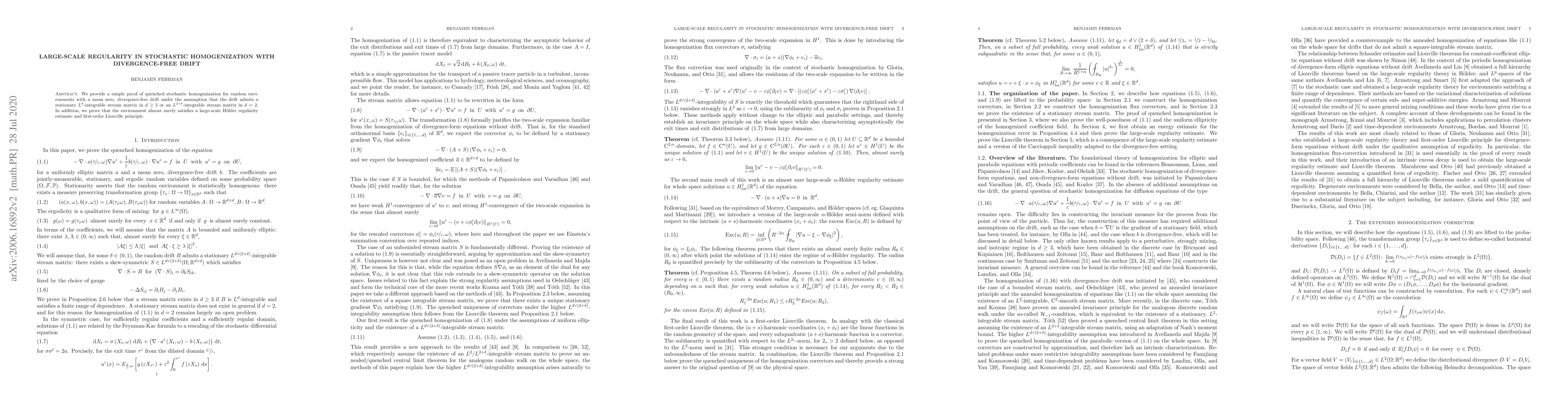 This paper presents a proof of quenched stochastic homogenization for random environments with a mean zero, divergence-free drift, showing large-scale regularity and a first-order Liouville principle under specific integrability conditions. The results hold in dimensions $d\geq 3$ and $d=2$ with different matrix integrability requirements.