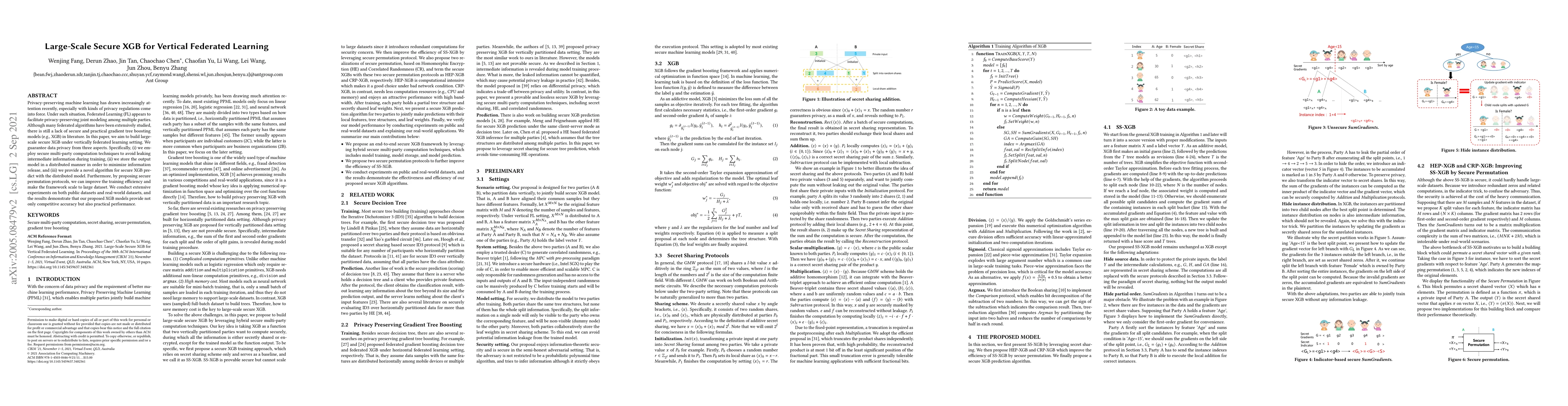 This paper proposes a secure, large-scale gradient tree boosting model (XGB) for vertical federated learning, ensuring data privacy through secure multi-party computation, distributed model storage, and efficient training protocols. Experiments show competitive accuracy and practical performance on both public and real-world datasets.