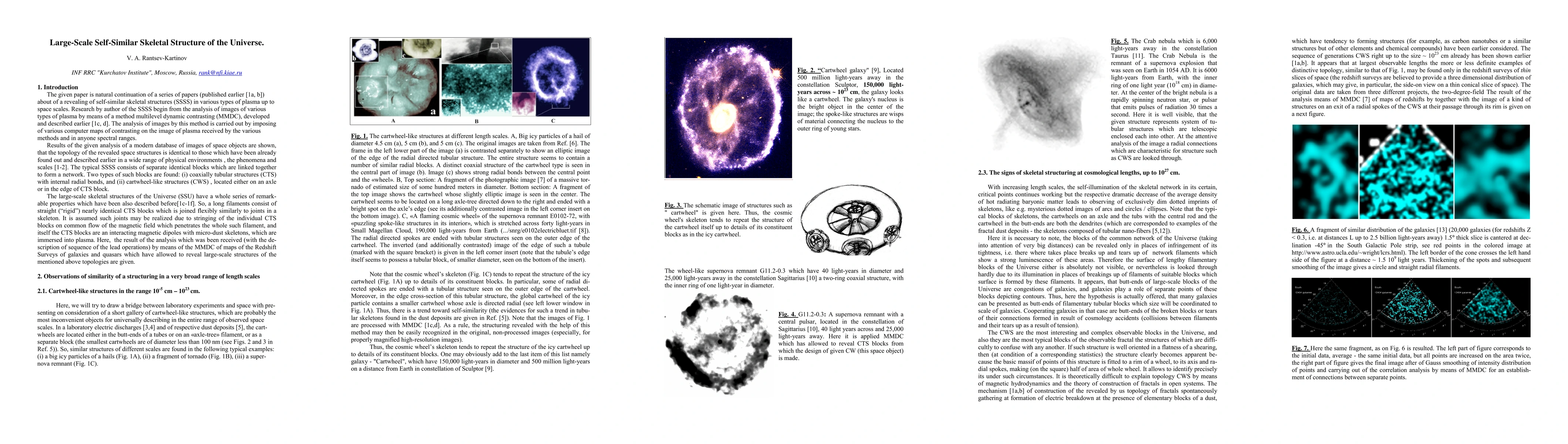 This paper analyzes redshift maps of galaxies and quasars to reveal large-scale, self-similar skeletal structures in the Universe, similar to those found in various phenomena across different scales. A notable "cartwheel" structure with a diameter of ~1.5 x 10^27 cm is identified using multi-level dynamical contrasting.
