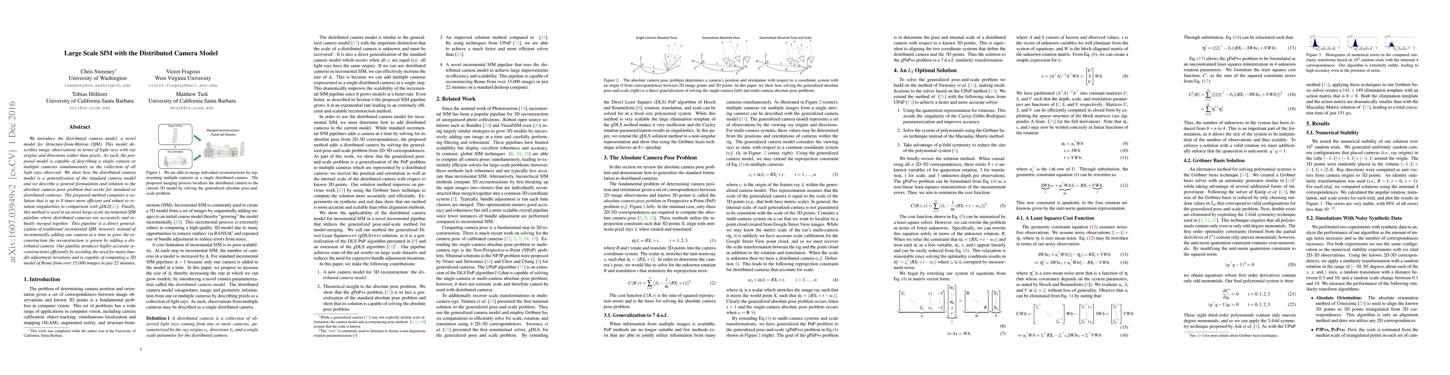 We introduce the distributed camera model, a novel model for Structure-from-Motion (SfM). This model describes image observations in terms of light rays with ray origins and directions rather than pixels. As such, the proposed model is capable of describing a single camera or multiple cameras simultaneously as the collection of all light rays observed. We show how the distributed camera model is a generalization of the standard camera model and describe a general formulation and solution to the absolute camera pose problem that works for standard or distributed cameras. The proposed method computes a solution that is up to 8 times more efficient and robust to rotation singularities in comparison with gDLS. Finally, this method is used in an novel large-scale incremental SfM pipeline where distributed cameras are accurately and robustly merged together. This pipeline is a direct generalization of traditional incremental SfM; however, instead of incrementally adding one camera at a time to grow the reconstruction the reconstruction is grown by adding a distributed camera. Our pipeline produces highly accurate reconstructions efficiently by avoiding the need for many bundle adjustment iterations and is capable of computing a 3D model of Rome from over 15,000 images in just 22 minutes.