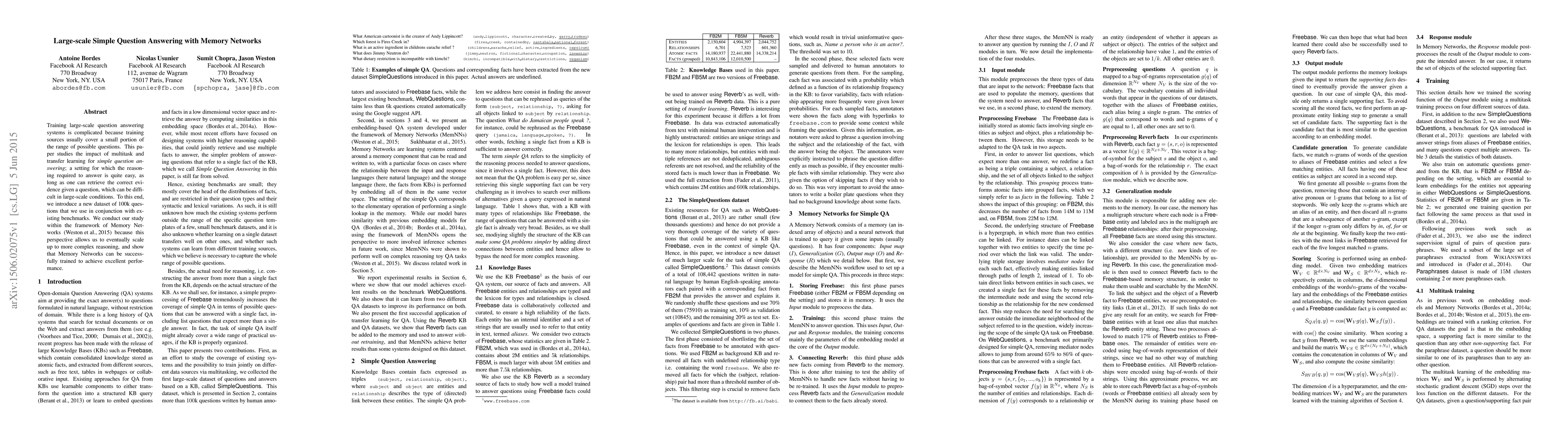 Researchers developed a new dataset of 100k questions to study large-scale simple question answering systems using Memory Networks. They found that multitask and transfer learning can improve performance in large-scale conditions.