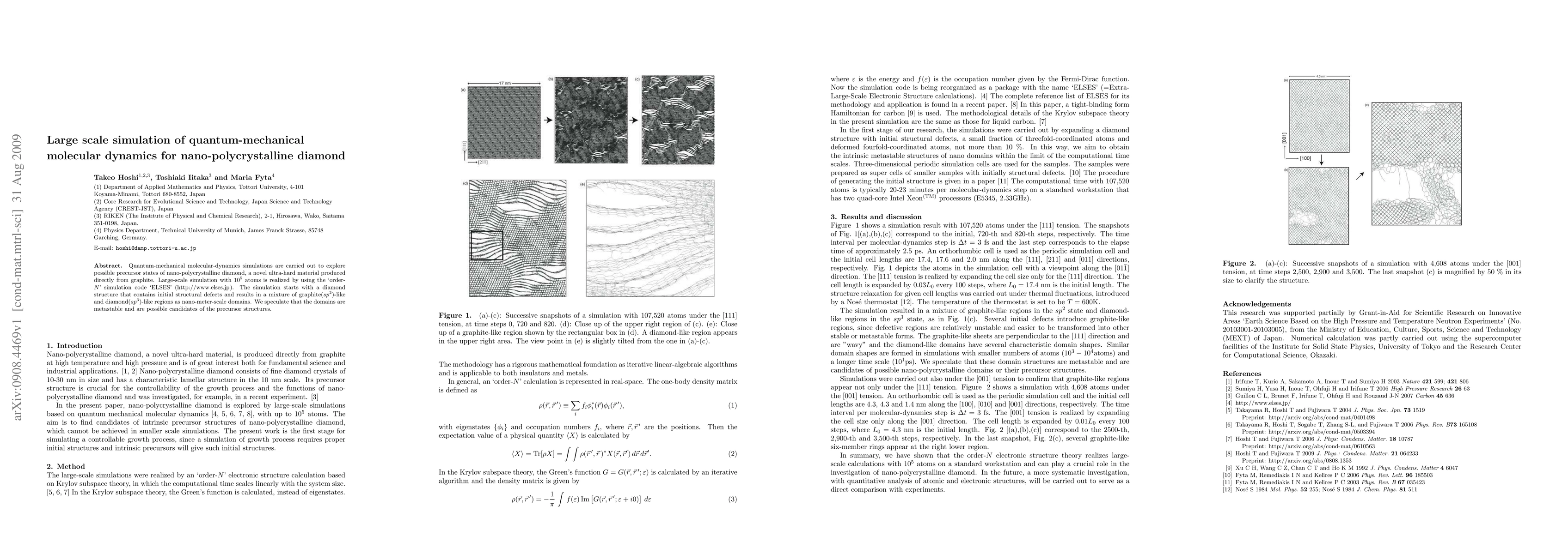 This paper presents large-scale quantum-mechanical molecular-dynamics simulations of nano-polycrystalline diamond using the 'ELSES' code, revealing a mixture of graphite-like and diamond-like regions at the nano-scale, suggesting these domains may serve as metastable precursor states for the material.