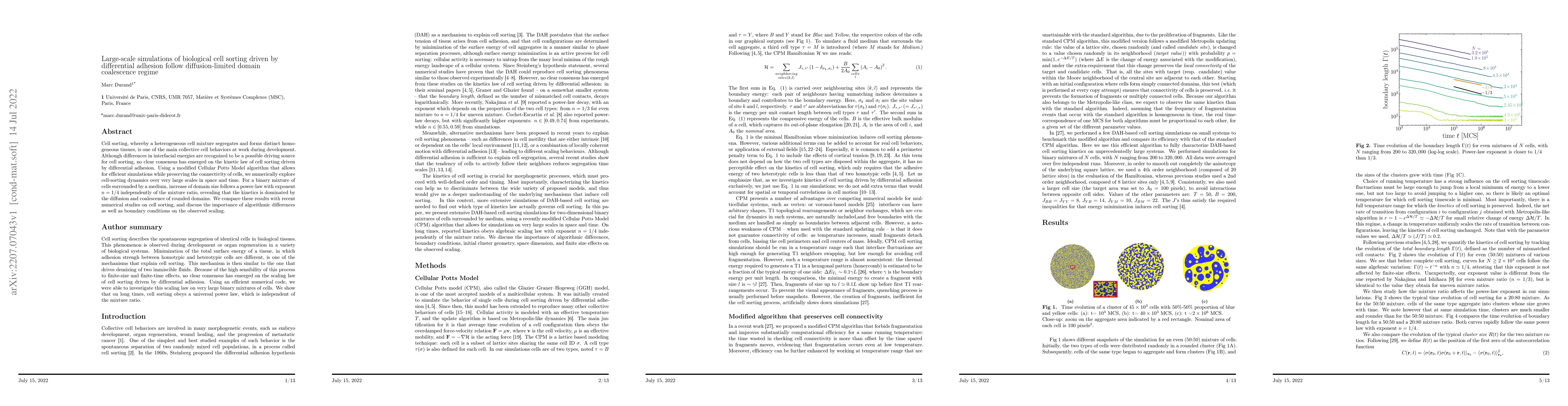 This paper investigates large-scale simulations of cell sorting driven by differential adhesion using a modified Cellular Potts Model, revealing a diffusion-limited domain coalescence regime with a power-law growth exponent of $n=1/4$. The study highlights the importance of algorithmic and boundary condition differences in determining the kinetic laws of cell sorting.