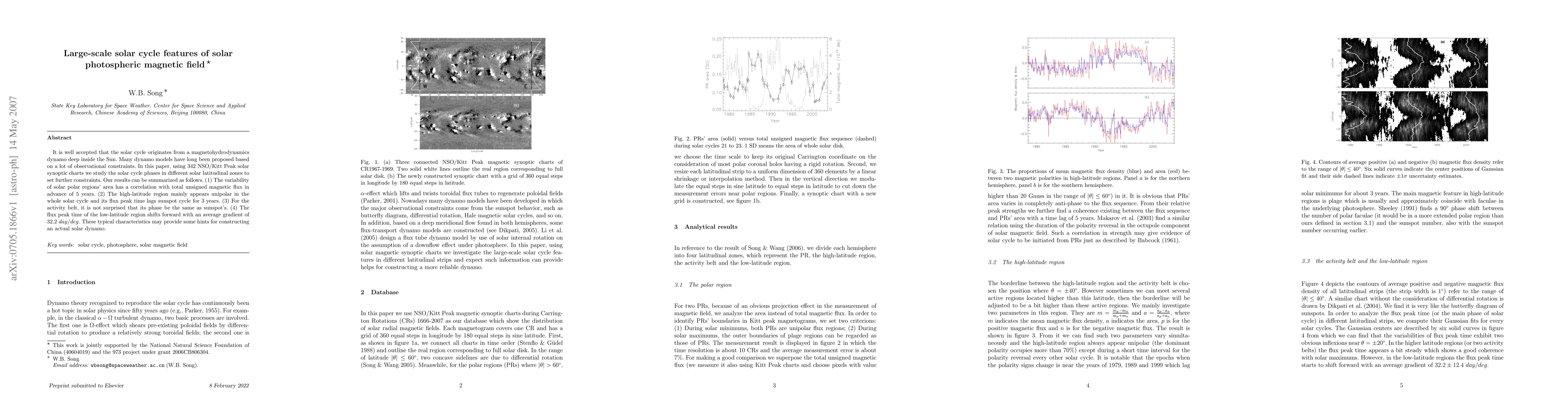 This paper investigates solar cycle features in different latitudinal zones using 342 NSO/Kitt Peak solar synoptic charts, revealing that solar polar regions' area variability correlates with total unsigned magnetic flux five years in advance, and low-latitude flux peak shifts forward at a gradient of 32.2 day/deg.