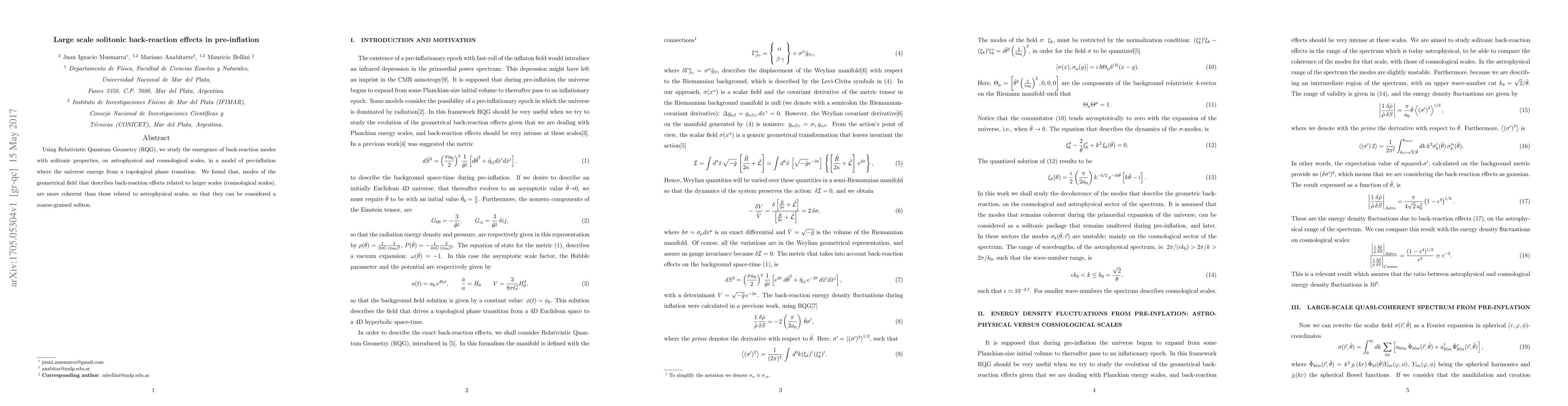 Using Relativistic Quantum Geometry (RQG), we study the emergence of back-reaction modes with solitonic properties, on astrophysical and cosmological scales, in a model of pre-inflation where the universe emerge from a topological phase transition. We found that, modes of the geometrical field that describes back-reaction effects related to larger scales (cosmological scales), are more coherent than those related to astrophysical scales, so that they can be considered a coarse-grained soliton.