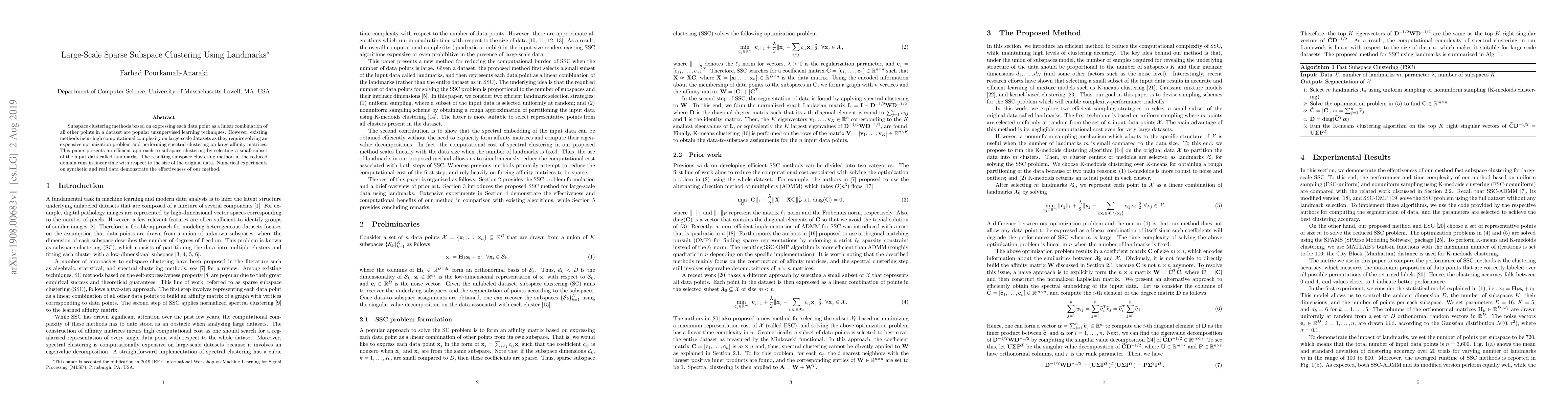 This paper proposes an efficient subspace clustering method for large-scale datasets by selecting a small subset of landmarks, reducing computational complexity from solving an expensive optimization problem and performing spectral clustering on large affinity matrices. Experiments show the method's effectiveness in both synthetic and real data.
