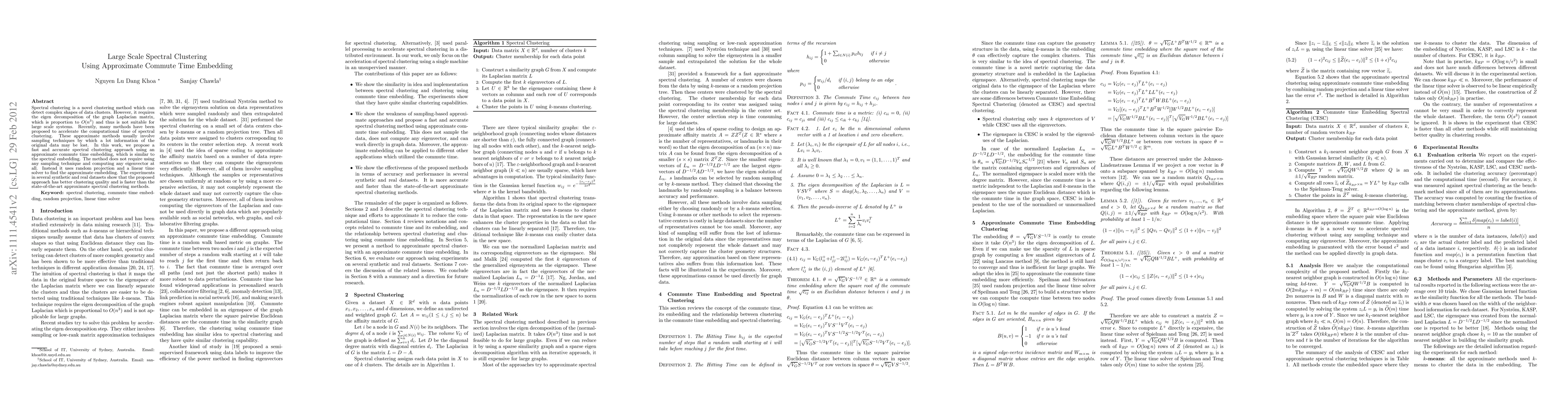 This paper proposes a fast spectral clustering method using approximate commute time embedding, avoiding the costly eigen decomposition of the graph Laplacian matrix. It employs random projection and a linear time solver, demonstrating superior clustering quality and speed compared to existing approximate methods on both synthetic and real datasets.