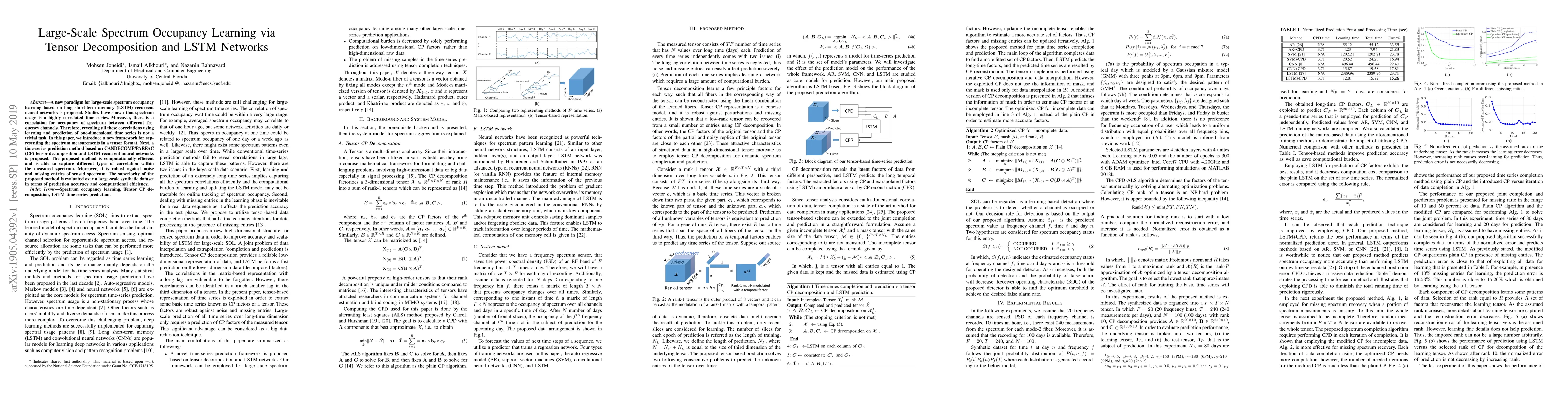 This paper proposes a new framework for large-scale spectrum occupancy learning using tensor decomposition and LSTM networks. It leverages CP tensor decomposition and LSTM to efficiently capture correlations in spectrum usage across time and frequency channels, demonstrating superior prediction accuracy and computational efficiency on synthetic data.