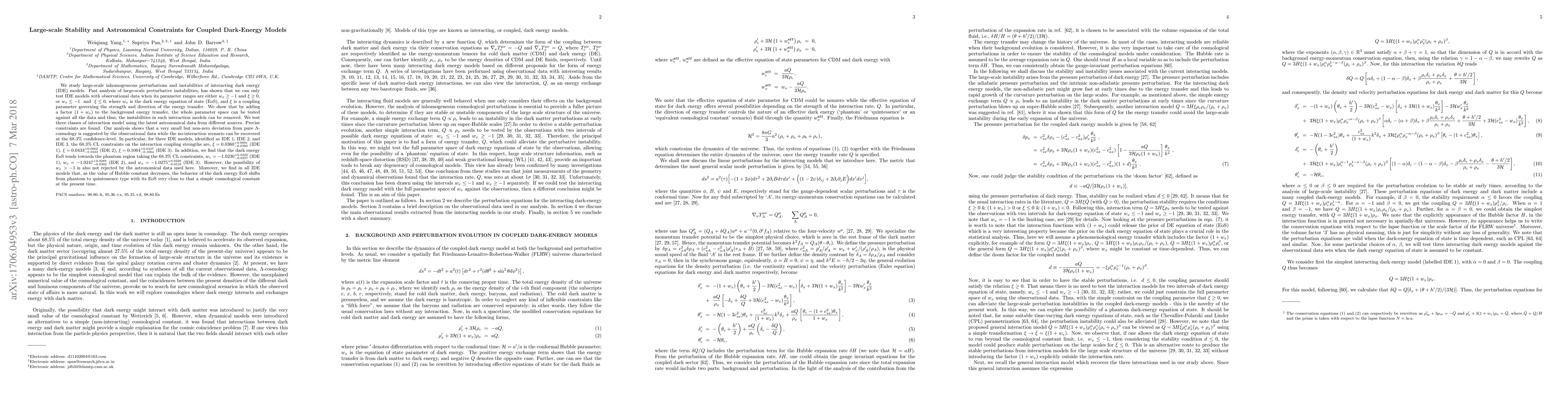 We study large-scale inhomogeneous perturbations and instabilities of interacting dark energy (IDE) models. Past analysis of large-scale perturbative instabilities, has shown that we can only test IDE models with observational data when its parameter ranges are either $w_{x}\geq -1$ and $\xi \geq 0,$ or $w_{x}\leq -1~$ and $~\xi \leq 0$, where $w_{x}$ is the dark energy equation of state (EoS), and $\xi$ is a coupling parameter governing the strength and direction of the energy transfer. We show that by adding a factor $(1+w_{x})$ to the background energy transfer, the whole parameter space can be tested against all the data and thus, the instabilities in such interaction models can be removed. We test three classes of interaction model using the latest astronomical data from different sources. Precise constraints are found. Our analysis shows that a very small but non-zero deviation from pure $\Lambda$-cosmology is suggested by the observational data while the no-interaction scenario can be recovered at the 68.3% confidence-level. In particular, for three IDE models, identified as IDE 1, IDE 2, and IDE 3, the 68.3% CL constraints on the interaction coupling strengths are, $\xi= 0.0360_{-0.0360}^{+0.0091}$ (IDE 1), $\xi= 0.0433_{-0.0433}^{+0.0062}$ (IDE 2), $\xi= 0.1064_{-0.1064}^{+0.0437}$ (IDE 3). In addition, we find that the dark energy EoS tends towards the phantom region taking the 68.3% CL constraints, $w_x= -1.0230_{-0.0257}^{+0.0329}$ (IDE 1), $w_x= -1.0247_{-0.0302}^{+0.0289}$ (IDE 2), and $w_x= -1.0275_{-0.0318}^{+0.0228}$ (IDE 3). However, the possibility of $w_{x}>-1$ is also not rejected by the astronomical data used here. Moreover, we find in all IDE models that, as the value of Hubble constant decreases, the behavior of the dark energy EoS shifts from phantom to quintessence type with its EoS very close to that a simple cosmological constant at the present time.