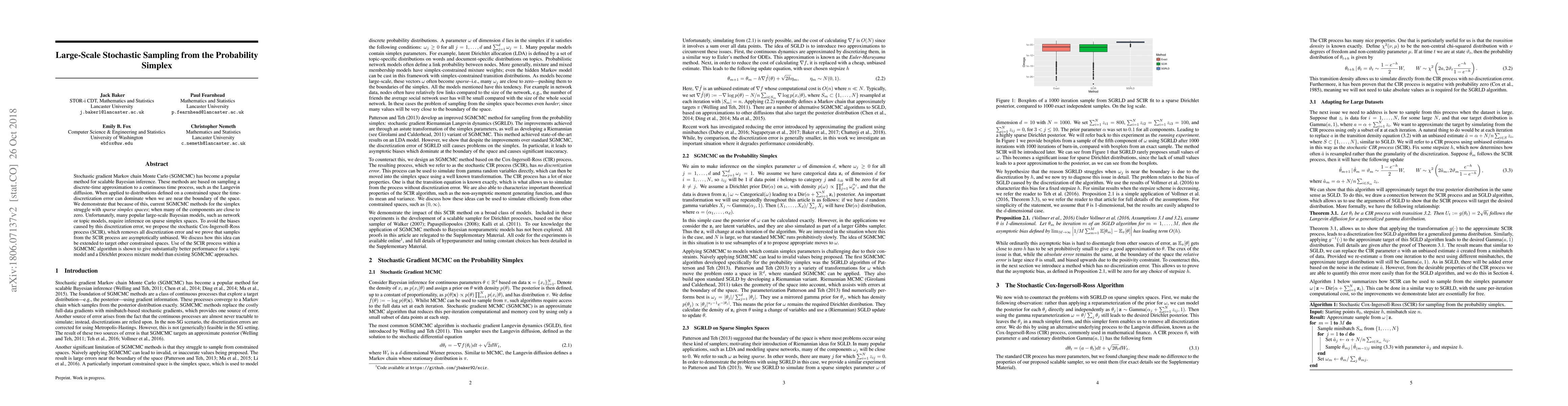 This paper proposes the stochastic Cox-Ingersoll-Ross process (SCIR) to improve large-scale Bayesian inference on sparse simplex spaces, addressing the discretization error in existing SGMCMC methods. The SCIR process is shown to provide asymptotically unbiased samples and significantly outperforms current methods for models like topic models and Dirichlet process mixtures.