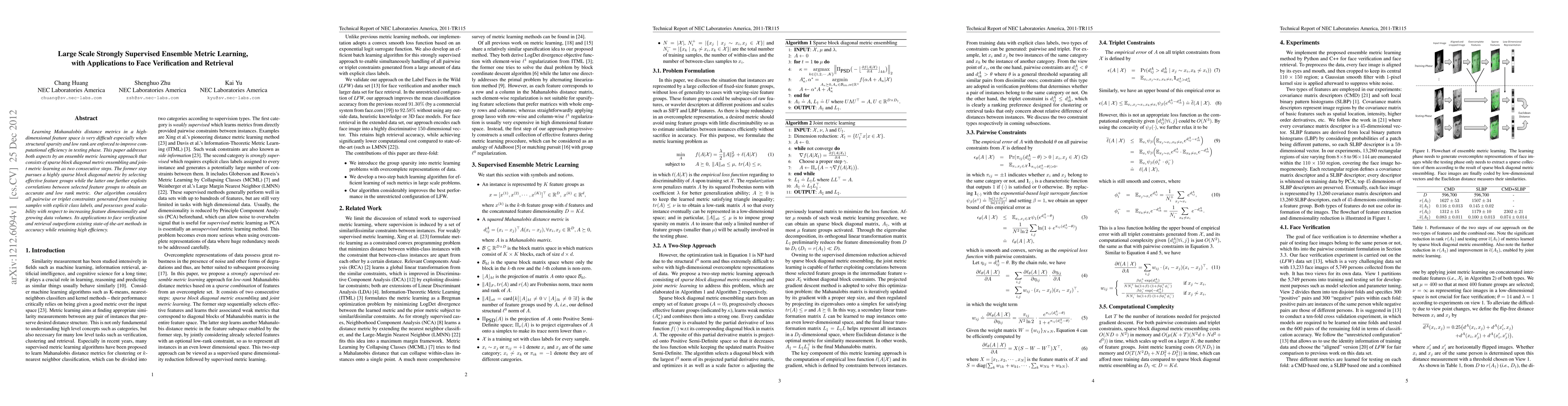 Learning Mahanalobis distance metrics in a high- dimensional feature space is very difficult especially when structural sparsity and low rank are enforced to improve com- putational efficiency in testing phase. This paper addresses both aspects by an ensemble metric learning approach that consists of sparse block diagonal metric ensembling and join- t metric learning as two consecutive steps. The former step pursues a highly sparse block diagonal metric by selecting effective feature groups while the latter one further exploits correlations between selected feature groups to obtain an accurate and low rank metric. Our algorithm considers all pairwise or triplet constraints generated from training samples with explicit class labels, and possesses good scala- bility with respect to increasing feature dimensionality and growing data volumes. Its applications to face verification and retrieval outperform existing state-of-the-art methods in accuracy while retaining high efficiency.