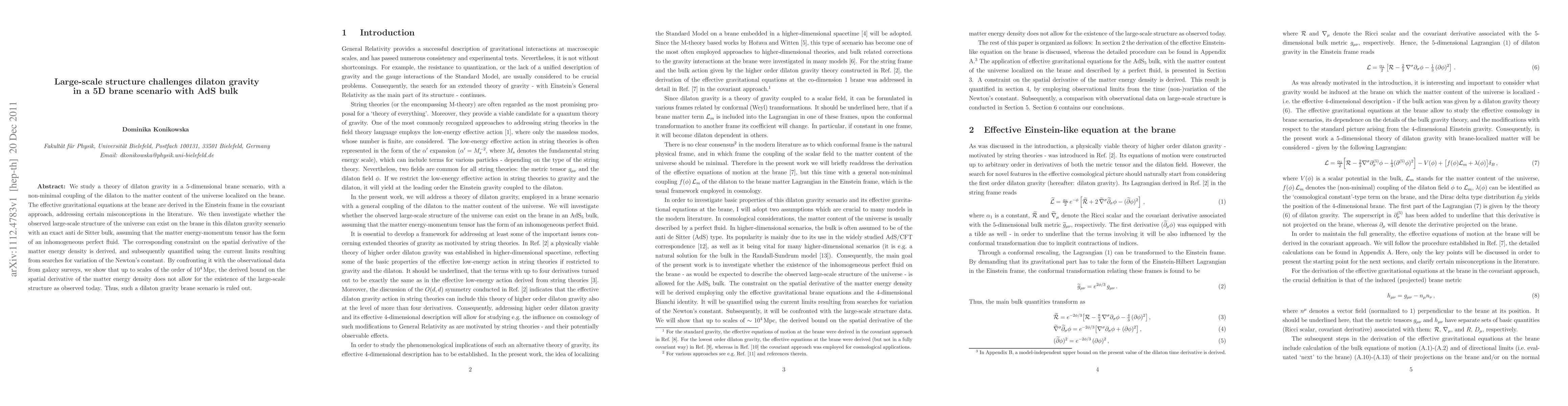 We study a theory of dilaton gravity in a 5-dimensional brane scenario, with a non-minimal coupling of the dilaton to the matter content of the universe localized on the brane. The effective gravitational equations at the brane are derived in the Einstein frame in the covariant approach, addressing certain misconceptions in the literature. We then investigate whether the observed large-scale structure of the universe can exist on the brane in this dilaton gravity scenario with an exact anti de Sitter bulk, assuming that the matter energy-momentum tensor has the form of an inhomogeneous perfect fluid. The corresponding constraint on the spatial derivative of the matter energy density is derived, and subsequently quantified using the current limits resulting from searches for variation of the Newton's constant. By confronting it with the observational data from galaxy surveys, we show that up to scales of the order of 10^4 Mpc, the derived bound on the spatial derivative of the matter energy density does not allow for the existence of the large-scale structure as observed today. Thus, such a dilaton gravity brane scenario is ruled out.