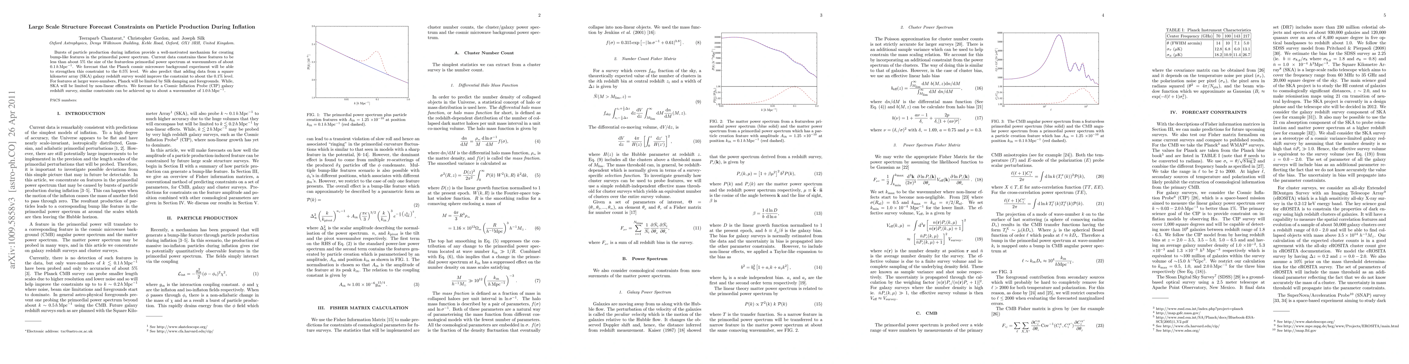 This paper forecasts that the Planck CMB experiment will tighten constraints on particle production during inflation to 0.5%, and with a SKA galaxy survey, this can be improved to 0.1%. For higher wavenumbers, Planck and SKA face limitations due to damping and non-linear effects, respectively.