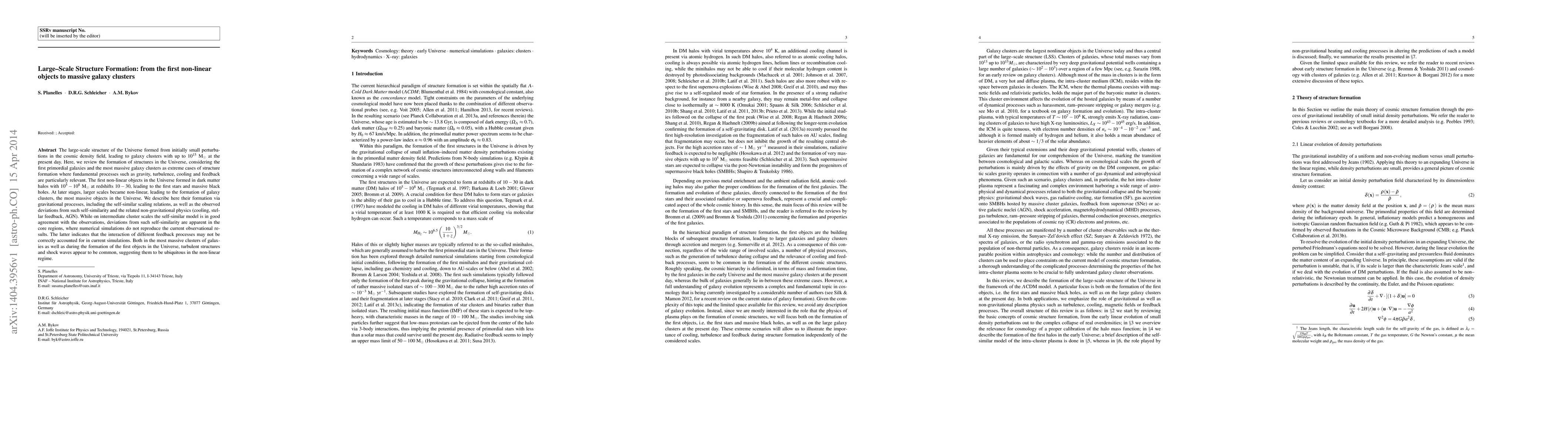This paper reviews the formation of cosmic structures from the first primordial galaxies to the most massive galaxy clusters, emphasizing the roles of gravity, turbulence, and feedback mechanisms. It highlights the non-linear growth of dark matter halos leading to the first stars and black holes, and the subsequent formation of galaxy clusters, noting discrepancies between simulations and observations in the core regions.