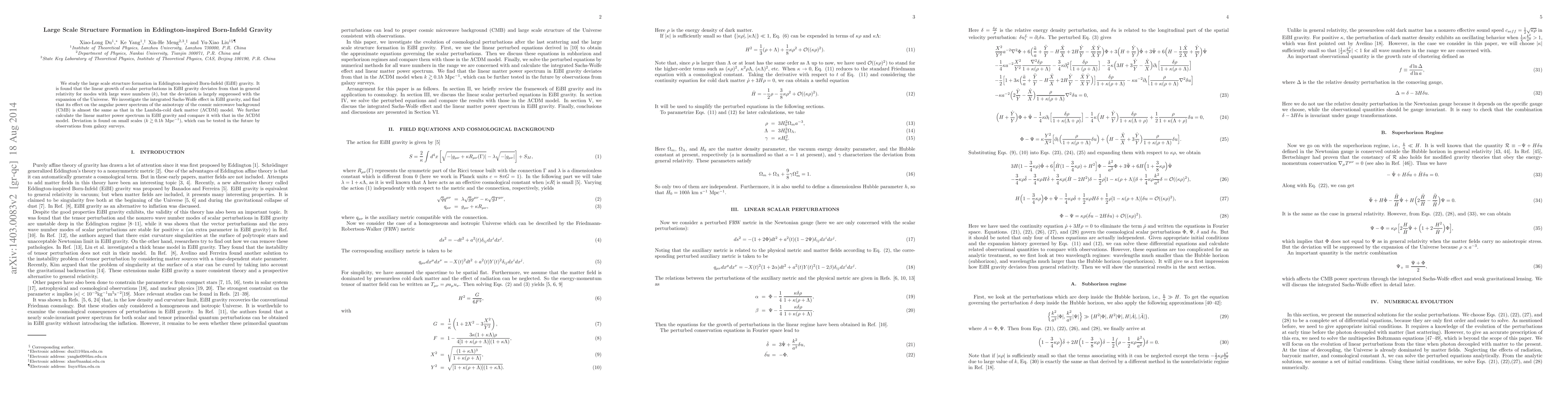 We study the large scale structure formation in Eddington-inspired Born-Infeld (EiBI) gravity. It is found that the linear growth of scalar perturbations in EiBI gravity deviates from that in general relativity for modes with large wave numbers ($k$), but the deviation is largely suppressed with the expansion of the Universe. We investigate the integrated Sachs-Wolfe effect in EiBI gravity, and find that its effect on the angular power spectrum of the anisotropy of the cosmic microwave background (CMB) is almost the same as that in the Lambda-cold dark matter ($\Lambda$CDM) model. We further calculate the linear matter power spectrum in EiBI gravity and compare it with that in the $\Lambda$CDM model. Deviation is found on small scales ($k\gtrsim 0.1 h$ Mpc$^{-1}$), which can be tested in the future by observations from galaxy surveys.