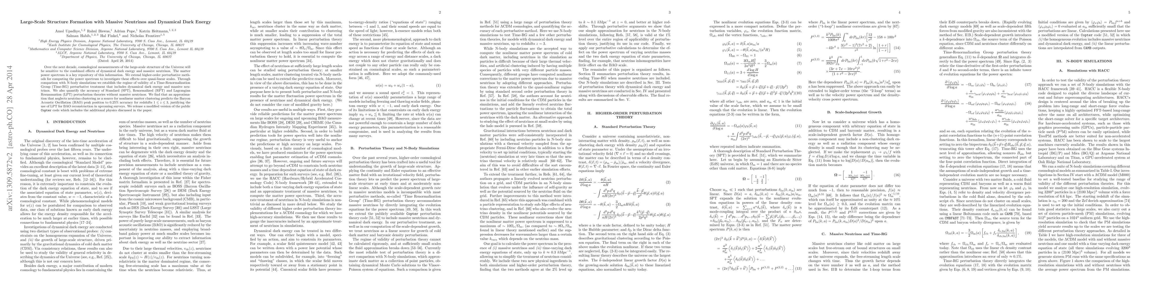 This paper investigates the impact of dynamical dark energy and massive neutrinos on the large-scale structure formation using advanced perturbation theory methods. It finds that Lagrangian Perturbation Theory can accurately predict the Baryon Acoustic Oscillation peak position for redshifts 1 < z < 3, justifying its use in future surveys.
