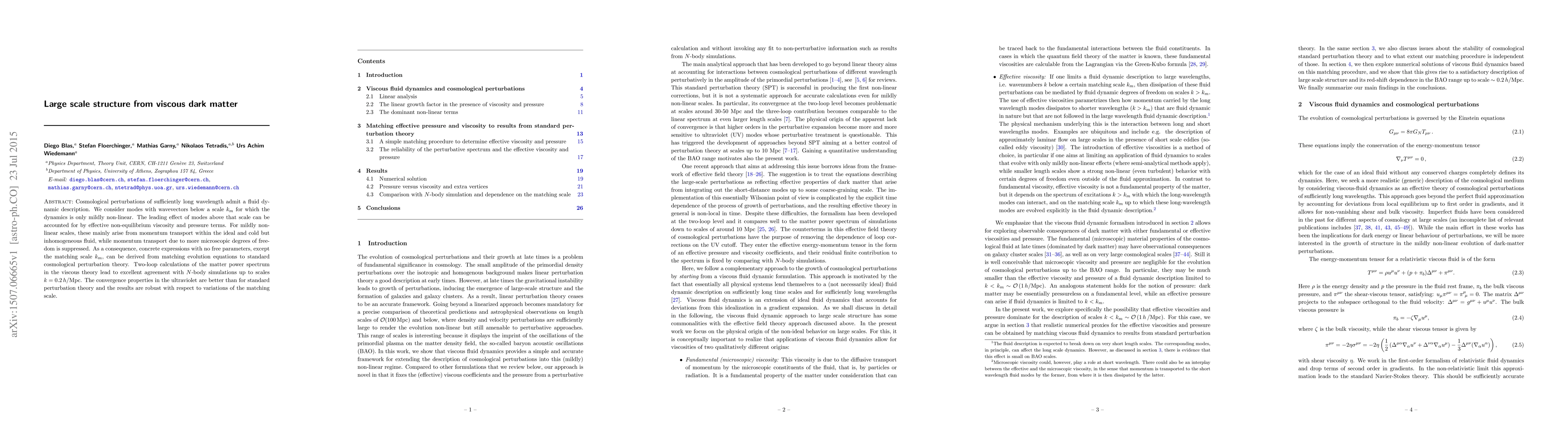 Cosmological perturbations of sufficiently long wavelength admit a fluid dynamic description. We consider modes with wavevectors below a scale $k_m$ for which the dynamics is only mildly non-linear. The leading effect of modes above that scale can be accounted for by effective non-equilibrium viscosity and pressure terms. For mildly non-linear scales, these mainly arise from momentum transport within the ideal and cold but inhomogeneous fluid, while momentum transport due to more microscopic degrees of freedom is suppressed. As a consequence, concrete expressions with no free parameters, except the matching scale $k_m$, can be derived from matching evolution equations to standard cosmological perturbation theory. Two-loop calculations of the matter power spectrum in the viscous theory lead to excellent agreement with $N$-body simulations up to scales $k=0.2 \, h/$Mpc. The convergence properties in the ultraviolet are better than for standard perturbation theory and the results are robust with respect to variations of the matching scale.