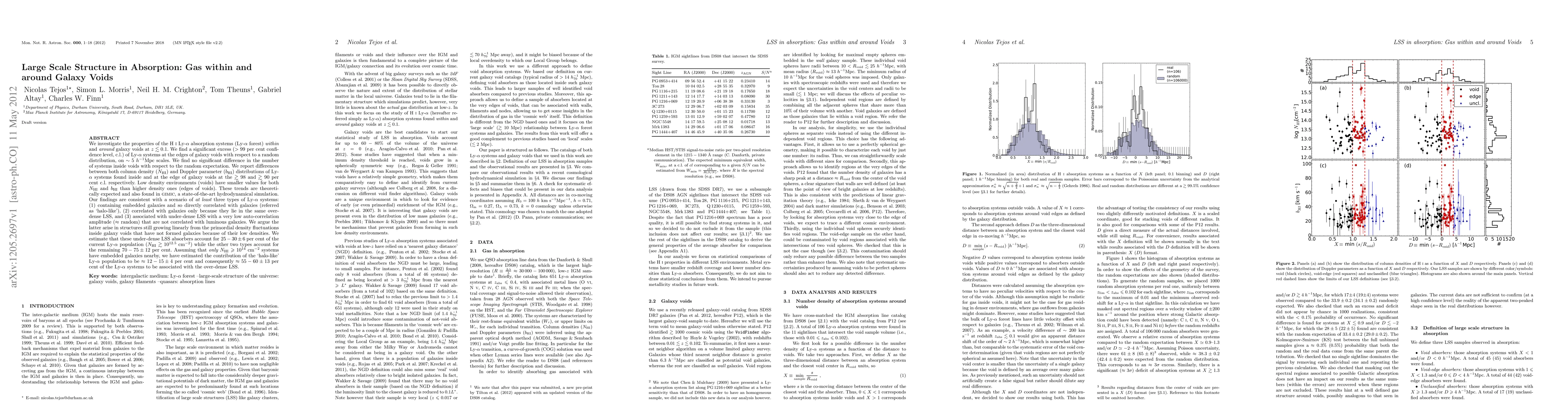 We investigate the properties of the HI Ly-a absorption systems (Ly-a forest) within and around galaxy voids at z<0.1. We find a significant excess (>99% c.l.) of Ly-a systems at the edges of galaxy voids with respect to a random distribution, on ~5 h^{-1} Mpc scales. We find no significant difference in the number of systems inside voids with respect to the random expectation. We report differences between both column density (N_{HI}) and Doppler parameter (b_{HI}) distributions of Ly-a systems found inside and at the edge of galaxy voids at the >98% and >90% c.l. respectively. Low density environments (voids) have smaller values for both N_{HI} and b_{HI} than higher density ones (edges of voids). These trends are theoretically expected and also found in GIMIC, a state-of-the-art hydrodynamical simulation. Our findings are consistent with a scenario of at least three types of Ly-alpha: (1) containing embedded galaxies and so directly correlated with galaxies (referred as `halo-like'), (2) correlated with galaxies only because they lie in the same over-dense LSS, and (3) associated with under-dense LSS with a very low auto-correlation amplitude (~ random) that are not correlated with luminous galaxies. We argue the latter arise in structures still growing linearly from the primordial density fluctuations inside galaxy voids that have not formed galaxies because of their low densities. We estimate that these under-dense LSS absorbers account for 25-30% +- 6% of the current Ly-a population (N_{HI} > 10^{12.5} cm^{-2}) while the other two types account for the remaining 70-75% +- 12%. Assuming that only N_{HI} > 10^{14} cm^{-2} systems have embedded galaxies nearby, we have estimated the contribution of the `halo-like' Ly-a to be ~12-15% +- 4% and consequently ~55-60% +- 13% of the Ly-a systems to be associated with the over-dense LSS.