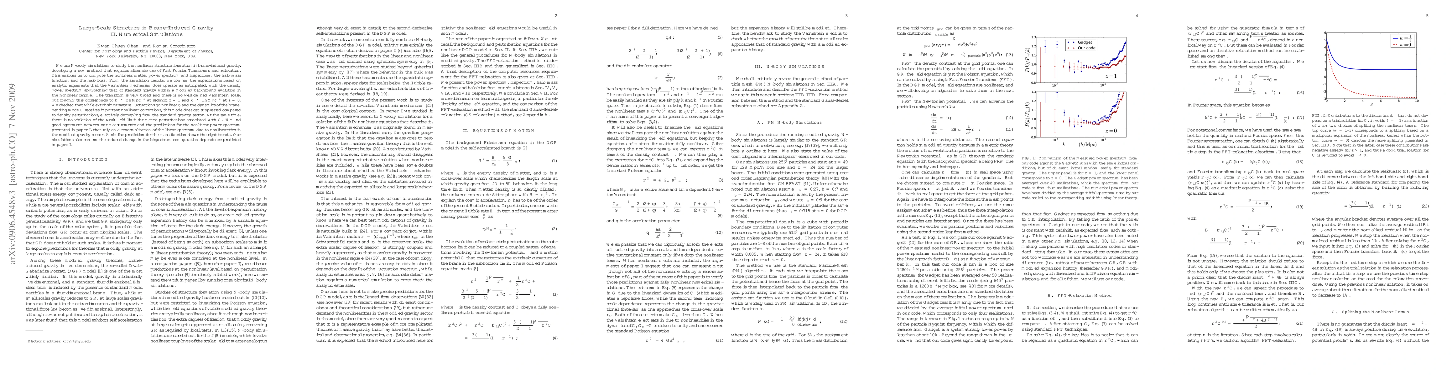We use N-body simulations to study the nonlinear structure formation in brane-induced gravity, developing a new method that requires alternate use of Fast Fourier Transforms and relaxation. This enables us to compute the nonlinear matter power spectrum and bispectrum, the halo mass function, and the halo bias. From the simulation results, we confirm the expectations based on analytic arguments that the Vainshtein mechanism does operate as anticipated, with the density power spectrum approaching that of standard gravity within a modified background evolution in the nonlinear regime. The transition is very broad and there is no well defined Vainshtein scale, but roughly this corresponds to k_*~ 2 at redshift z=1 and k_*~ 1 at z=0. We checked that while extrinsic curvature fluctuations go nonlinear, and the dynamics of the brane-bending mode C receives important nonlinear corrections, this mode does get suppressed compared to density perturbations, effectively decoupling from the standard gravity sector. At the same time, there is no violation of the weak field limit for metric perturbations associated with C. We find good agreement between our measurements and the predictions for the nonlinear power spectrum presented in paper I, that rely on a renormalization of the linear spectrum due to nonlinearities in the modified gravity sector. A similar prediction for the mass function shows the right trends. Our simulations also confirm the induced change in the bispectrum configuration dependence predicted in paper I.