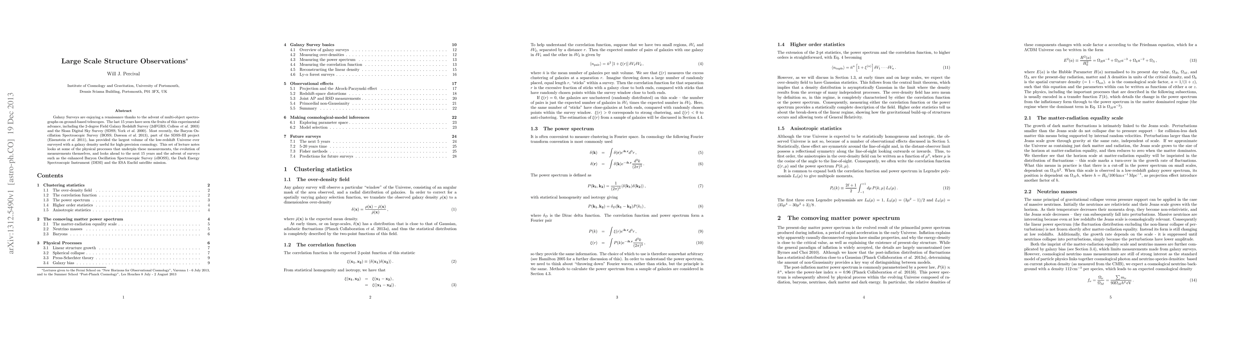 Galaxy Surveys are enjoying a renaissance thanks to the advent of multi-object spectrographs on ground-based telescopes. The last 15 years have seen the fruits of this experimental advance, including the 2-degree Field Galaxy Redshift Survey (2dFGRS; Colless et al. 2003) and the Sloan Digital Sky Survey (SDSS; York et al. 2000). Most recently, the Baryon Oscillation Spectroscopic Survey (BOSS; Dawson et al. 2013), part of the SDSS-III project (Eisenstein et al. 2011), has provided the largest volume of the low-redshift Universe ever surveyed with a galaxy density useful for high-precision cosmology. This set of lecture notes looks at some of the physical processes that underpin these measurements, the evolution of measurements themselves, and looks ahead to the next 15 years and the advent of surveys such as the enhanced Baryon Oscillation Spectroscopic Survey (eBOSS), the Dark Energy Spectroscopic Instrument (DESI) and the ESA Euclid satellite mission.