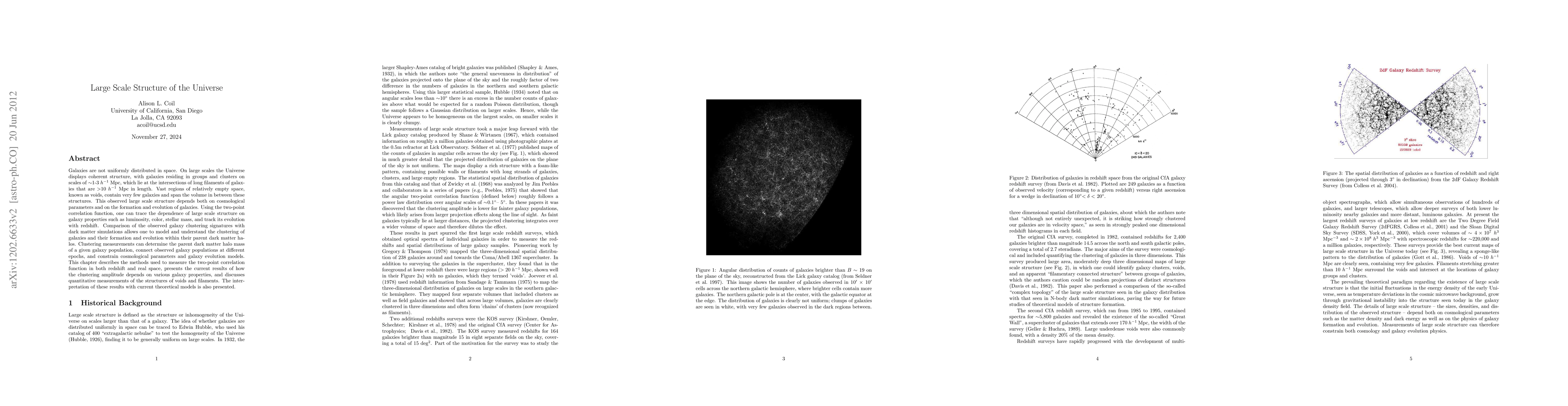 This paper explores the large-scale structure of the Universe, detailing how galaxies form coherent structures in clusters and filaments separated by vast voids. It uses the two-point correlation function to study galaxy clustering and its evolution, comparing observations with dark matter simulations to understand galaxy formation and cosmological parameters.