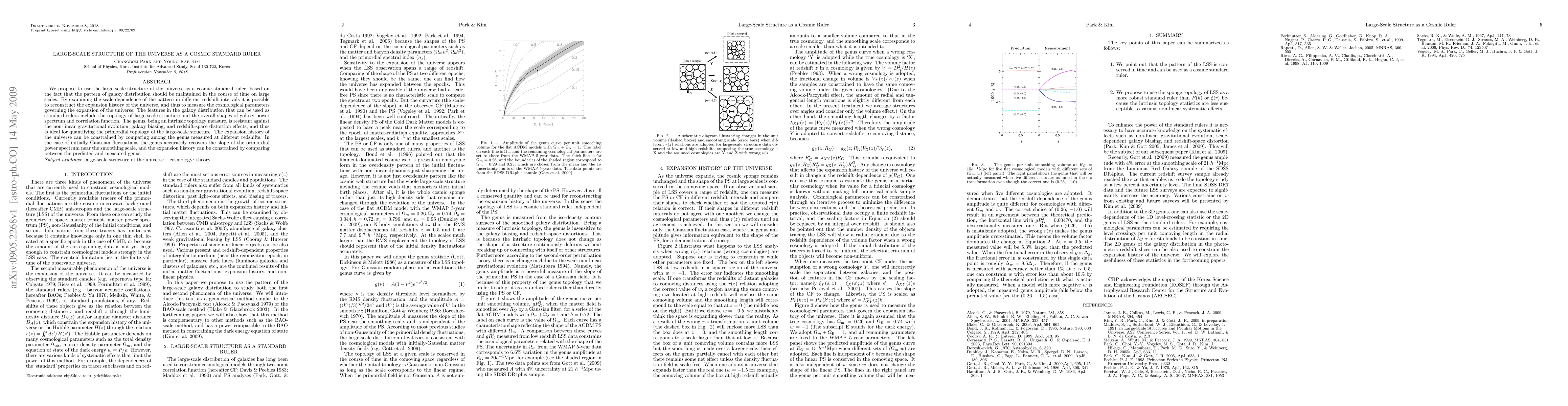 This paper proposes using the large-scale structure of the universe as a cosmic standard ruler to measure cosmological parameters by examining the time-invariant pattern of galaxy distribution. The genus, a topology measure, is identified as a robust indicator for quantifying the primordial structure, allowing for the reconstruction of the universe's expansion history through comparison across different redshifts.
