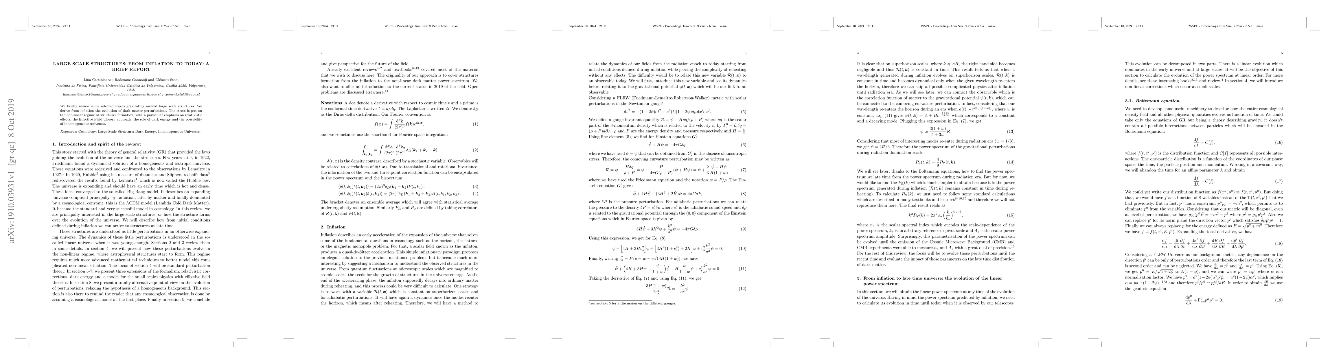 We briefly review some selected topics gravitating around large scale structures. We derive from inflation the evolution of dark matter perturbations. The stress is put on the non-linear regime of structures formation, with a particular emphasis on relativistic effects, the Effective Field Theory approach, the role of dark energy and the possibility of inhomogeneous universes.