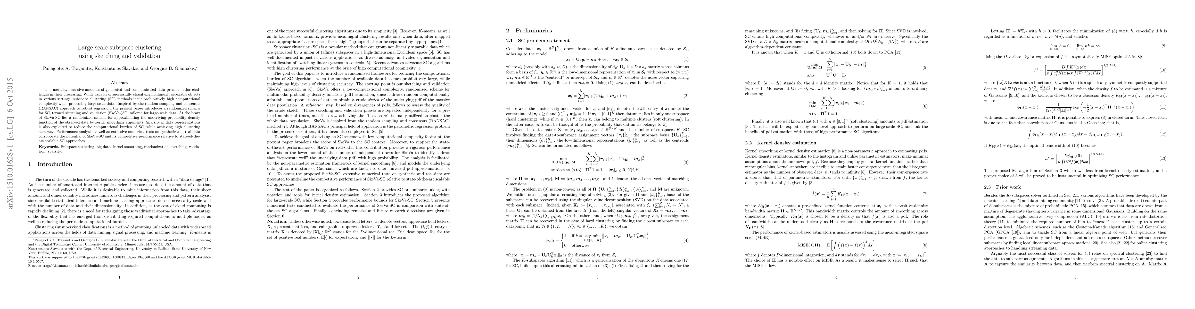 This paper proposes a randomized subspace clustering method called sketching and validation (SkeVa-SC) for processing large-scale data efficiently. It leverages kernel smoothing and data sparsity to approximate the probability density function and reduce computational complexity, achieving competitive performance compared to state-of-the-art scalable clustering methods.