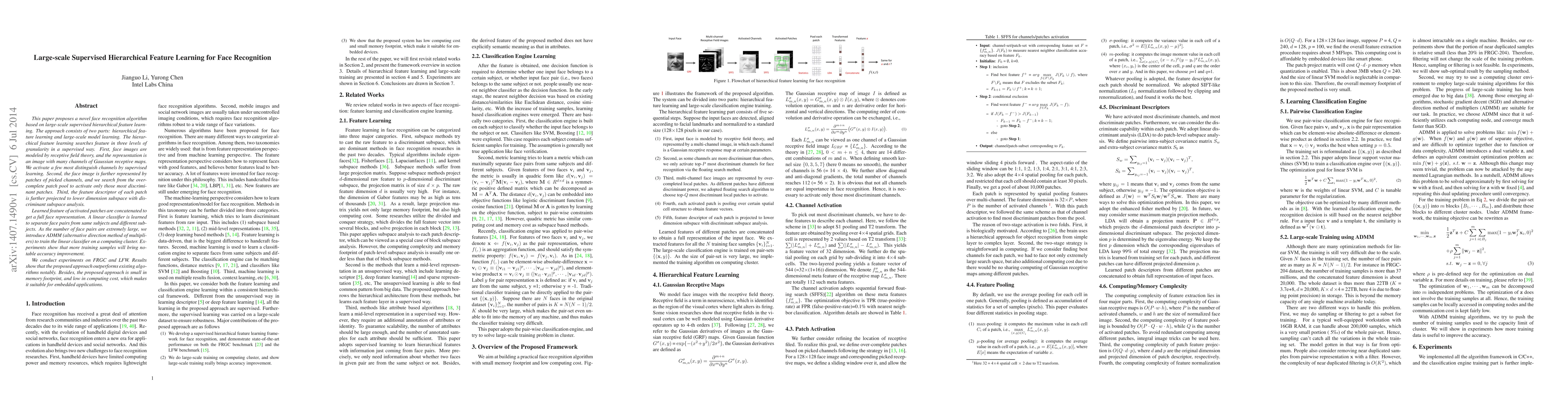 This paper introduces a supervised hierarchical feature learning method for face recognition, utilizing three levels of granularity to extract discriminative features and employing ADMM for efficient large-scale model training. Experiments on FRGC and LFW demonstrate superior performance compared to existing algorithms, with low memory and computing costs.