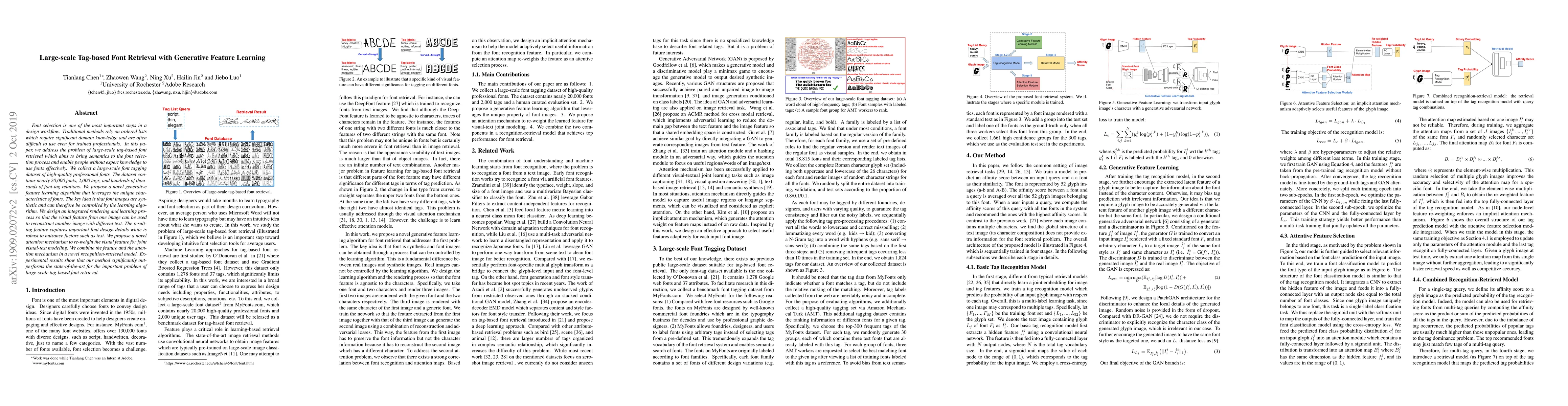 The paper proposes a large-scale tag-based font retrieval system using generative feature learning. It introduces a novel recognition-retrieval model that leverages a generative adversarial network (GAN) for feature learning and an attention mechanism for joint visual-text modeling.
