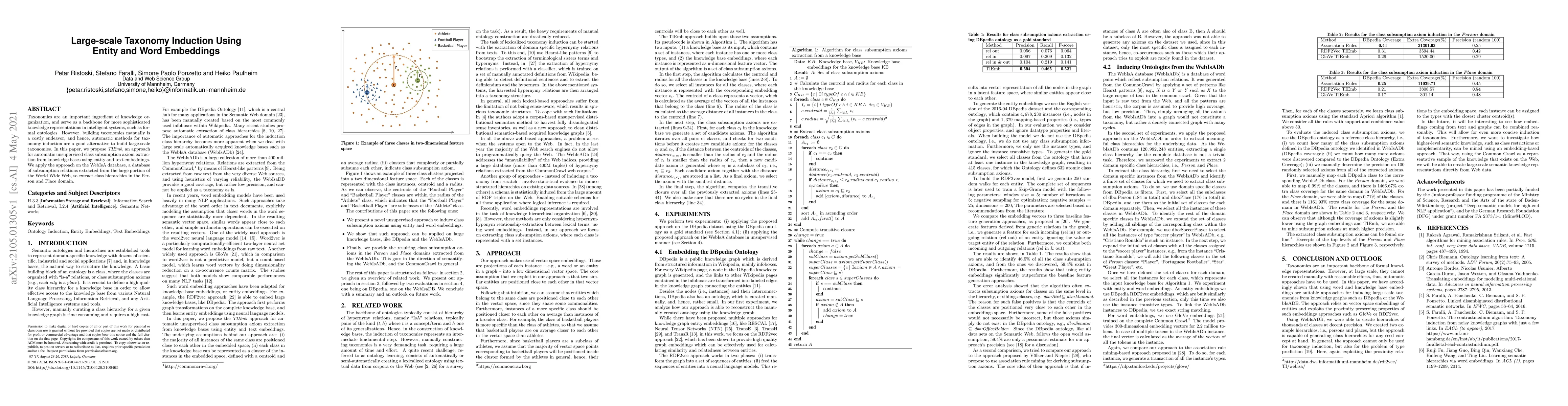 This paper proposes TIEmb, an unsupervised method for automatic taxonomy induction using entity and word embeddings to extract class hierarchies from knowledge bases. The approach is tested on the WebIsA database to generate taxonomies in the Person and Place domains.
