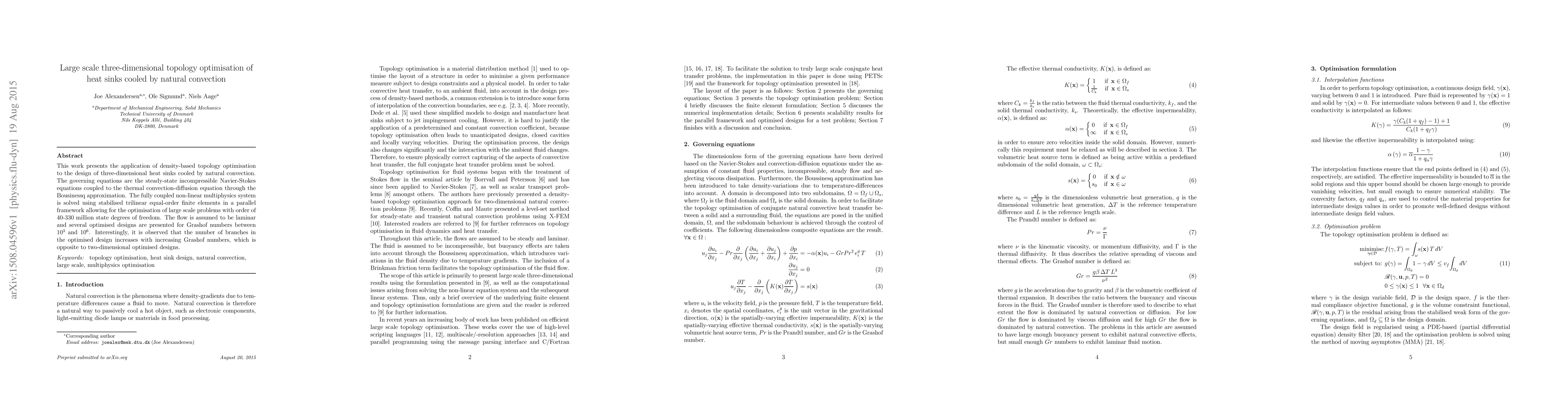 This paper applies density-based topology optimisation to design large-scale three-dimensional heat sinks cooled by natural convection, solving coupled Navier-Stokes and thermal convection-diffusion equations. The study reveals that optimised designs feature more branches as Grashof numbers increase, contrary to two-dimensional designs.