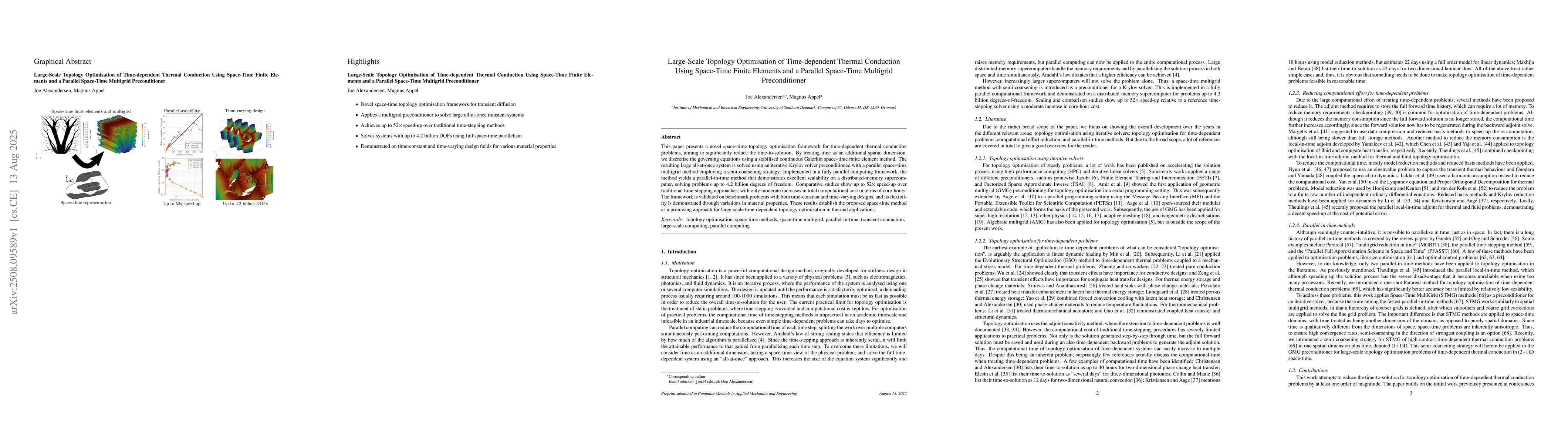 This paper presents a novel space-time topology optimisation framework for time-dependent thermal conduction problems, aiming to significantly reduce the time-to-solution. By treating time as an additional spatial dimension, we discretise the governing equations using a stabilised continuous Galerkin space-time finite element method. The resulting large all-at-once system is solved using an iterative Krylov solver preconditioned with a parallel space-time multigrid method employing a semi-coarsening strategy. Implemented in a fully parallel computing framework, the method yields a parallel-in-time method that demonstrates excellent scalability on a distributed-memory supercomputer, solving problems up to 4.2 billion degrees of freedom. Comparative studies show up to 52x speed-up over traditional time-stepping approaches, with only moderate increases in total computational cost in terms of core-hours. The framework is validated on benchmark problems with both time-constant and time-varying designs, and its flexibility is demonstrated through variations in material properties. These results establish the proposed space-time method as a promising approach for large-scale time-dependent topology optimisation in thermal applications.