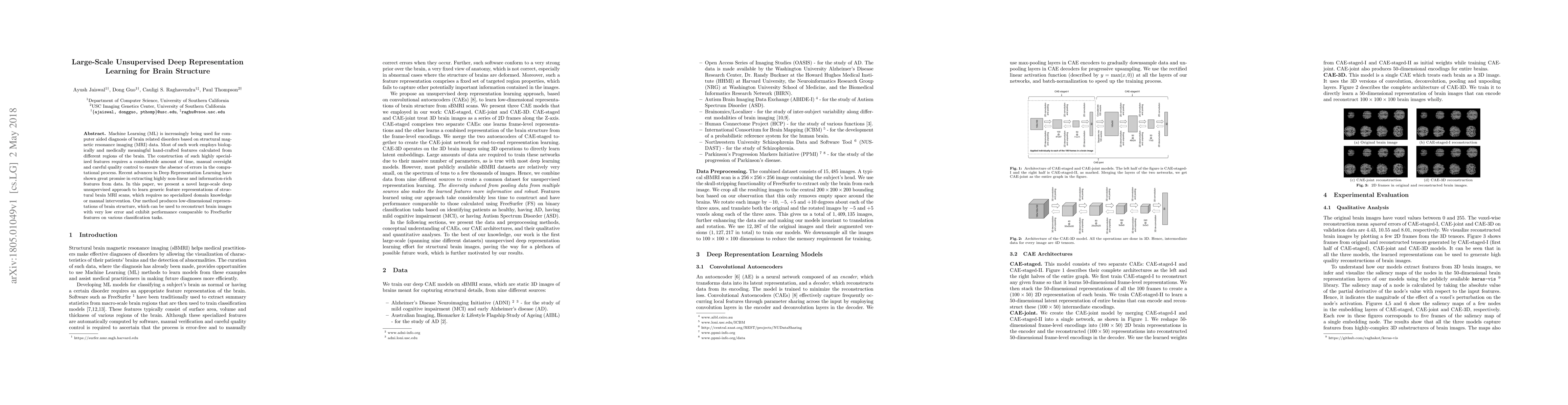 This paper introduces a large-scale unsupervised deep learning method for extracting generic representations from structural brain MRI scans without manual intervention. The method achieves low-dimensional representations that can reconstruct brain images with minimal error and perform comparably to hand-crafted features on classification tasks.