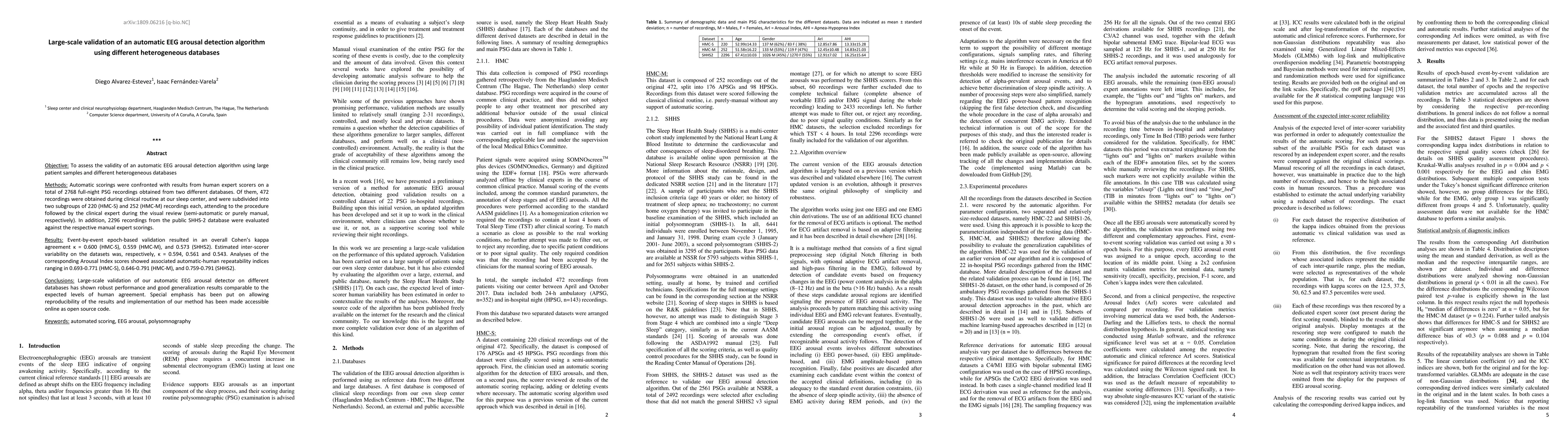 $\textbf{Objective}$: To assess the validity of an automatic EEG arousal detection algorithm using large patient samples and different heterogeneous databases $\textbf{Methods}$: Automatic scorings were confronted with results from human expert scorers on a total of 2768 full-night PSG recordings obtained from two different databases. Of them, 472 recordings were obtained during clinical routine at our sleep center and were subdivided into two subgroups of 220 (HMC-S) and 252 (HMC-M) recordings each, attending to the procedure followed by the clinical expert during the visual review (semi-automatic or purely manual, respectively). In addition, 2296 recordings from the public SHHS-2 database were evaluated against the respective manual expert scorings. $\textbf{Results}$: Event-by-event epoch-based validation resulted in an overall Cohen kappa agreement K = 0.600 (HMC-S), 0.559 (HMC-M), and 0.573 (SHHS-2). Estimated inter-scorer variability on the datasets was, respectively, K = 0.594, 0.561 and 0.543. Analyses of the corresponding Arousal Index scores showed associated automatic-human repeatability indices ranging in 0.693-0.771 (HMC-S), 0.646-0.791 (HMC-M), and 0.759-0.791 (SHHS-2). $\textbf{Conclusions}$: Large-scale validation of our automatic EEG arousal detector on different databases has shown robust performance and good generalization results comparable to the expected levels of human agreement. Special emphasis has been put on allowing reproducibility of the results and implementation of our method has been made accessible online as open source code