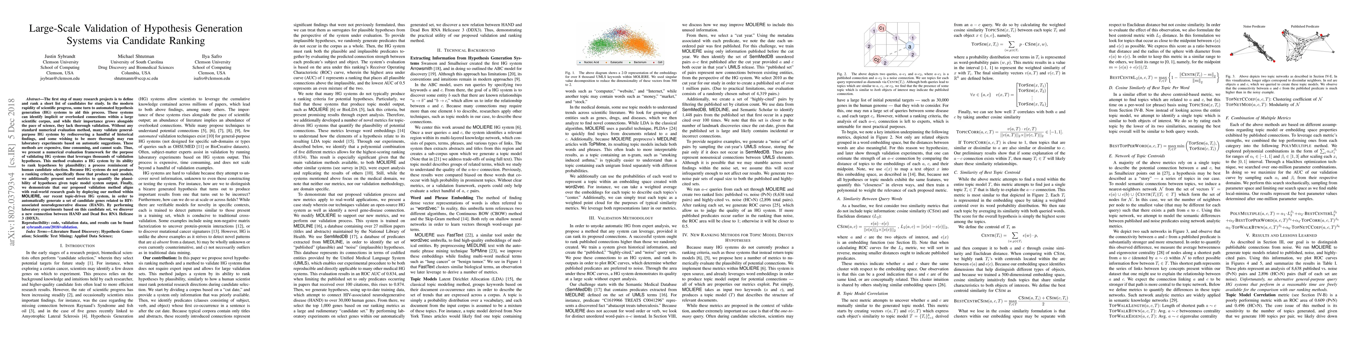 The first step of many research projects is to define and rank a short list of candidates for study. In the modern rapidity of scientific progress, some turn to automated hypothesis generation (HG) systems to aid this process. These systems can identify implicit or overlooked connections within a large scientific corpus, and while their importance grows alongside the pace of science, they lack thorough validation. Without any standard numerical evaluation method, many validate general-purpose HG systems by rediscovering a handful of historical findings, and some wishing to be more thorough may run laboratory experiments based on automatic suggestions. These methods are expensive, time consuming, and cannot scale. Thus, we present a numerical evaluation framework for the purpose of validating HG systems that leverages thousands of validation hypotheses. This method evaluates a HG system by its ability to rank hypotheses by plausibility; a process reminiscent of human candidate selection. Because HG systems do not produce a ranking criteria, specifically those that produce topic models, we additionally present novel metrics to quantify the plausibility of hypotheses given topic model system output. Finally, we demonstrate that our proposed validation method aligns with real-world research goals by deploying our method within Moliere, our recent topic-driven HG system, in order to automatically generate a set of candidate genes related to HIV-associated neurodegenerative disease (HAND). By performing laboratory experiments based on this candidate set, we discover a new connection between HAND and Dead Box RNA Helicase 3 (DDX3). Reproducibility: code, validation data, and results can be found at sybrandt.com/2018/validation.