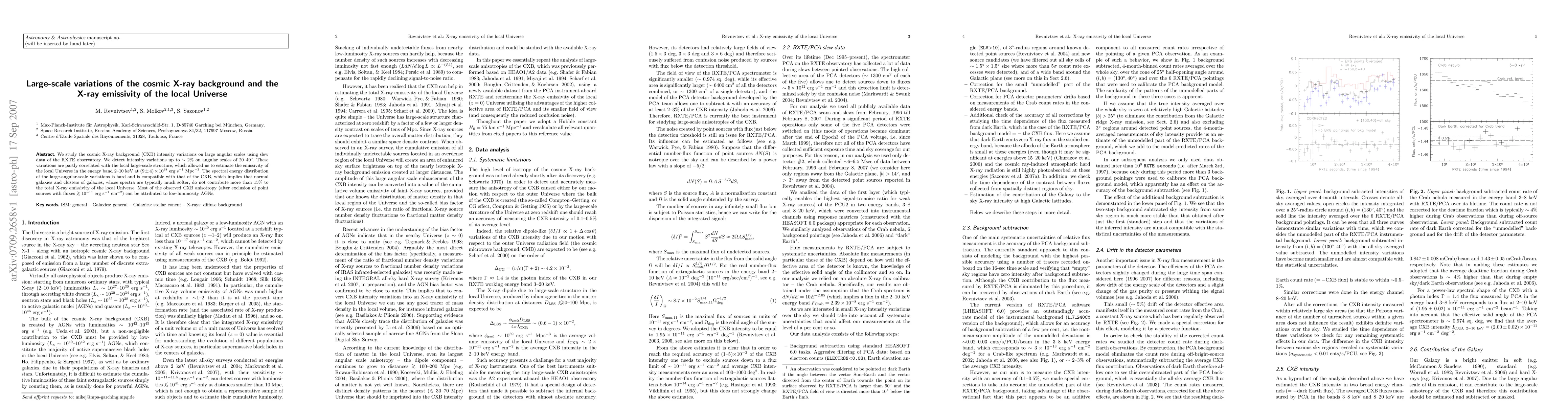 This paper investigates large-scale variations in the cosmic X-ray background (CXB) using RXTE data, finding ~2% intensity variations correlated with local large-scale structures. The study estimates the local Universe's X-ray emissivity at 9±4 x 10^{38} ers/sec/Mpc^{3}, attributing most CXB anisotropy to low-luminosity AGNs.