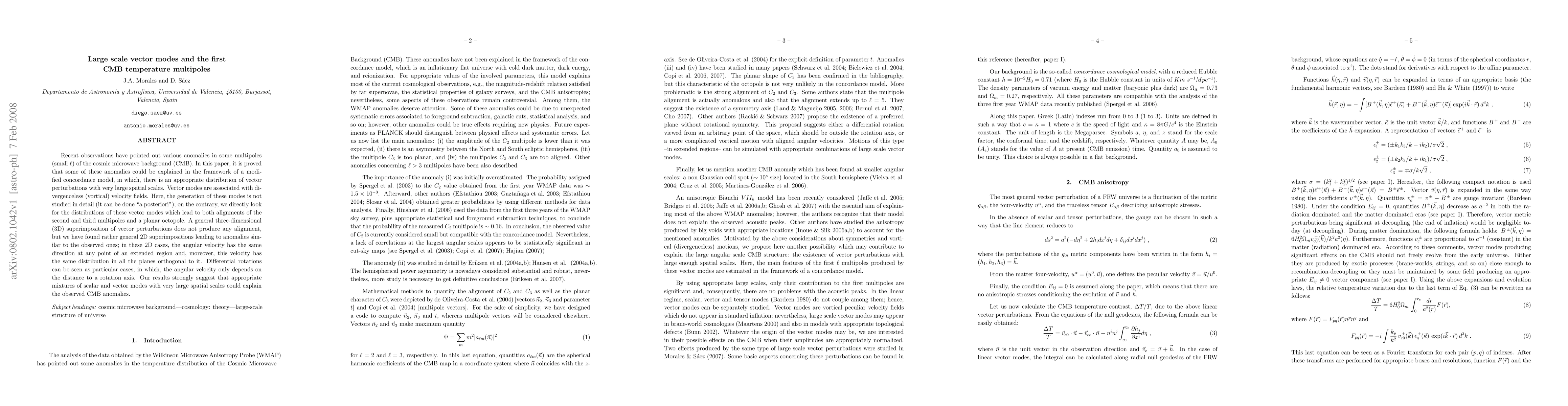 Recent observations have pointed out various anomalies in some multipoles (small $\ell $) of the cosmic microwave background (CMB). In this paper, it is proved that some of these anomalies could be explained in the framework of a modified concordance model, in which, there is an appropriate distribution of vector perturbations with very large spatial scales. Vector modes are associated with divergenceless (vortical) velocity fields. Here, the generation of these modes is not studied in detail (it can be done "a posteriori"); on the contrary, we directly look for the distributions of these vector modes which lead to both alignments of the second and third multipoles and a planar octopole. A general three-dimensional (3D) superimposition of vector perturbations does not produce any alignment, but we have found rather general 2D superimpositions leading to anomalies similar to the observed ones; in these 2D cases, the angular velocity has the same direction at any point of an extended region and, moreover, this velocity has the same distribution in all the planes orthogonal to it. Differential rotations can be seen as particular cases, in which, the angular velocity only depends on the distance to a rotation axis. Our results strongly suggest that appropriate mixtures of scalar and vector modes with very large spatial scales could explain the observed CMB anomalies.