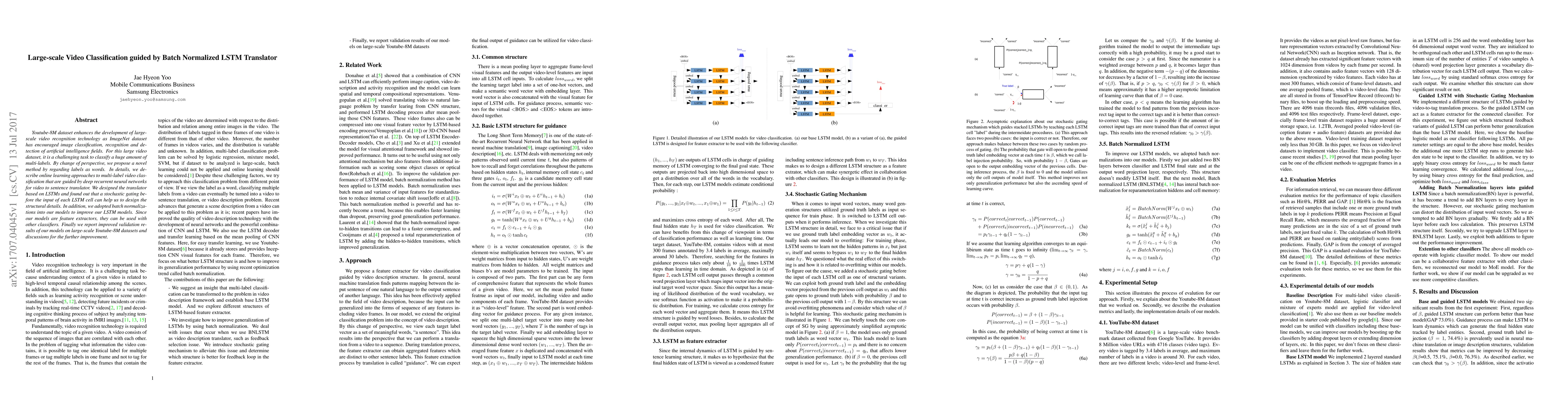 This paper presents a novel method for large-scale multi-label video classification using a video-to-sentence translator based on LSTMs with batch normalization. The approach leverages the Youtube-8M dataset and demonstrates improved performance through stochastic gating and batch normalization techniques.