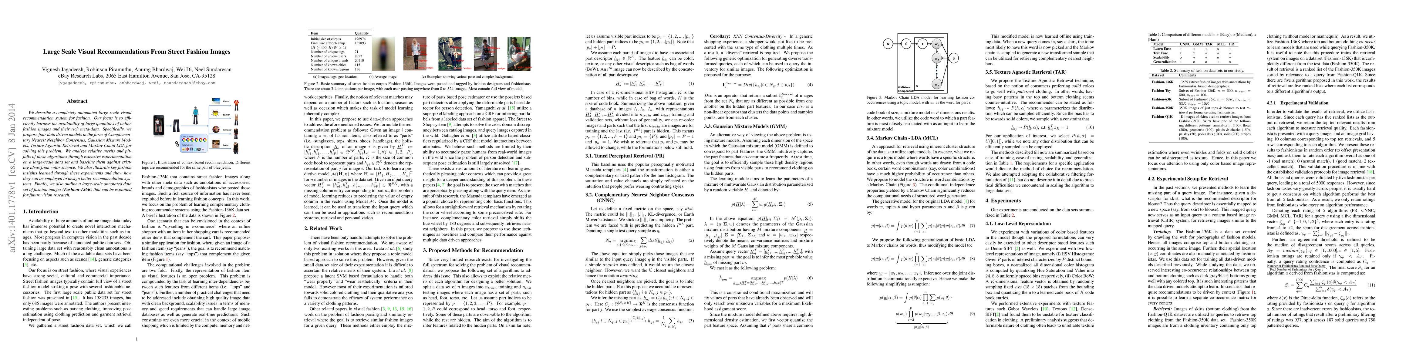 We describe a completely automated large scale visual recommendation system for fashion. Our focus is to efficiently harness the availability of large quantities of online fashion images and their rich meta-data. Specifically, we propose four data driven models in the form of Complementary Nearest Neighbor Consensus, Gaussian Mixture Models, Texture Agnostic Retrieval and Markov Chain LDA for solving this problem. We analyze relative merits and pitfalls of these algorithms through extensive experimentation on a large-scale data set and baseline them against existing ideas from color science. We also illustrate key fashion insights learned through these experiments and show how they can be employed to design better recommendation systems. Finally, we also outline a large-scale annotated data set of fashion images (Fashion-136K) that can be exploited for future vision research.