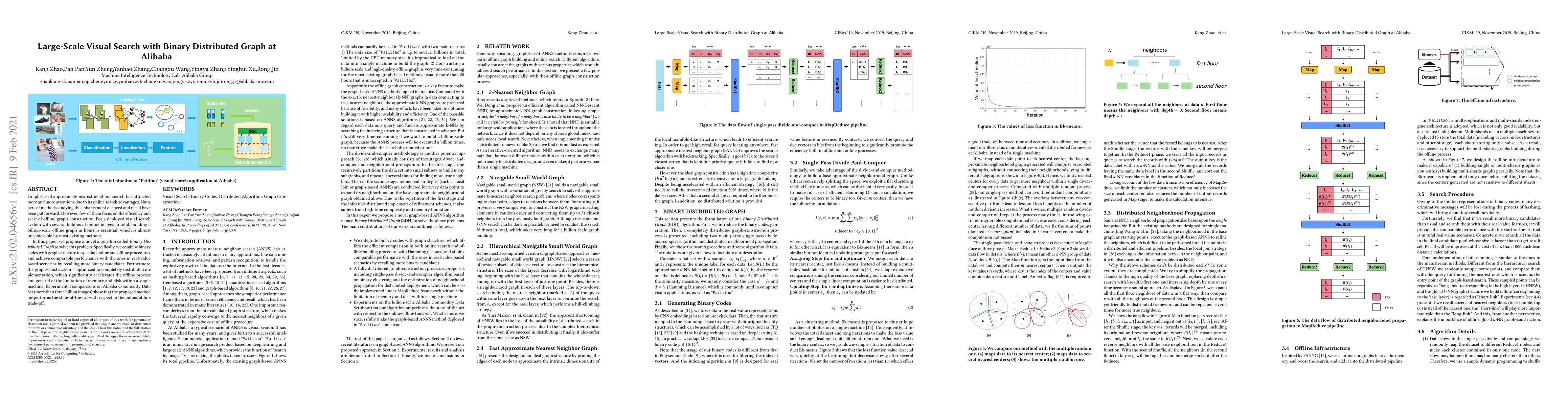 Graph-based approximate nearest neighbor search has attracted more and more attentions due to its online search advantages. Numbers of methods studying the enhancement of speed and recall have been put forward. However, few of them focus on the efficiency and scale of offline graph-construction. For a deployed visual search system with several billions of online images in total, building a billion-scale offline graph in hours is essential, which is almost unachievable by most existing methods. In this paper, we propose a novel algorithm called Binary Distributed Graph to solve this problem. Specifically, we combine binary codes with graph structure to speedup online and offline procedures, and achieve comparable performance with the ones in real-value based scenarios by recalling more binary candidates. Furthermore, the graph-construction is optimized to completely distributed implementation, which significantly accelerates the offline process and gets rid of the limitation of memory and disk within a single machine. Experimental comparisons on Alibaba Commodity Data Set (more than three billion images) show that the proposed method outperforms the state-of-the-art with respect to the online/offline trade-off.