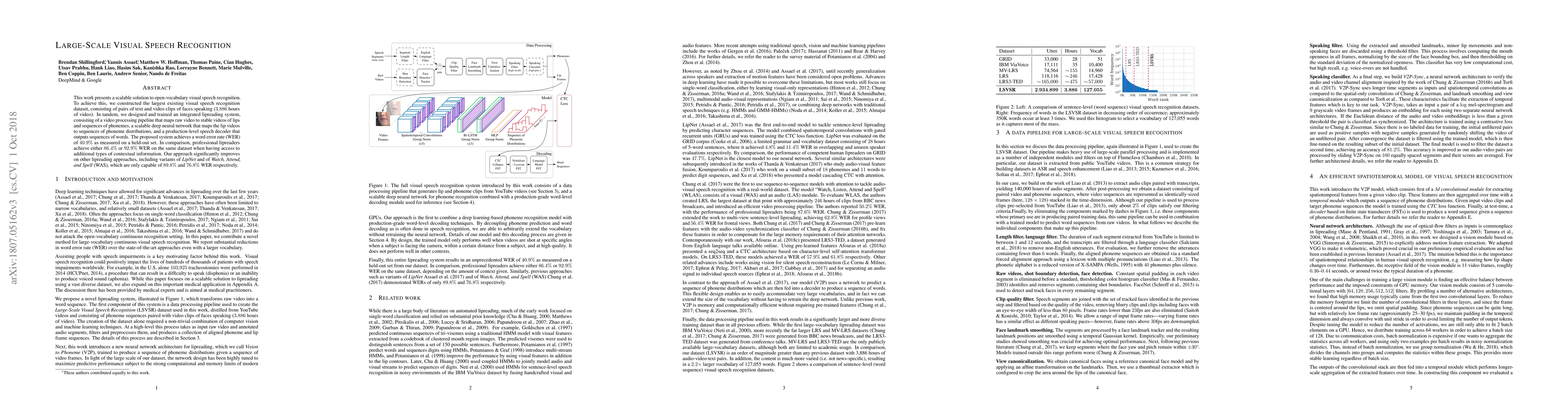 This work presents a scalable solution to open-vocabulary visual speech recognition. To achieve this, we constructed the largest existing visual speech recognition dataset, consisting of pairs of text and video clips of faces speaking (3,886 hours of video). In tandem, we designed and trained an integrated lipreading system, consisting of a video processing pipeline that maps raw video to stable videos of lips and sequences of phonemes, a scalable deep neural network that maps the lip videos to sequences of phoneme distributions, and a production-level speech decoder that outputs sequences of words. The proposed system achieves a word error rate (WER) of 40.9% as measured on a held-out set. In comparison, professional lipreaders achieve either 86.4% or 92.9% WER on the same dataset when having access to additional types of contextual information. Our approach significantly improves on other lipreading approaches, including variants of LipNet and of Watch, Attend, and Spell (WAS), which are only capable of 89.8% and 76.8% WER respectively.