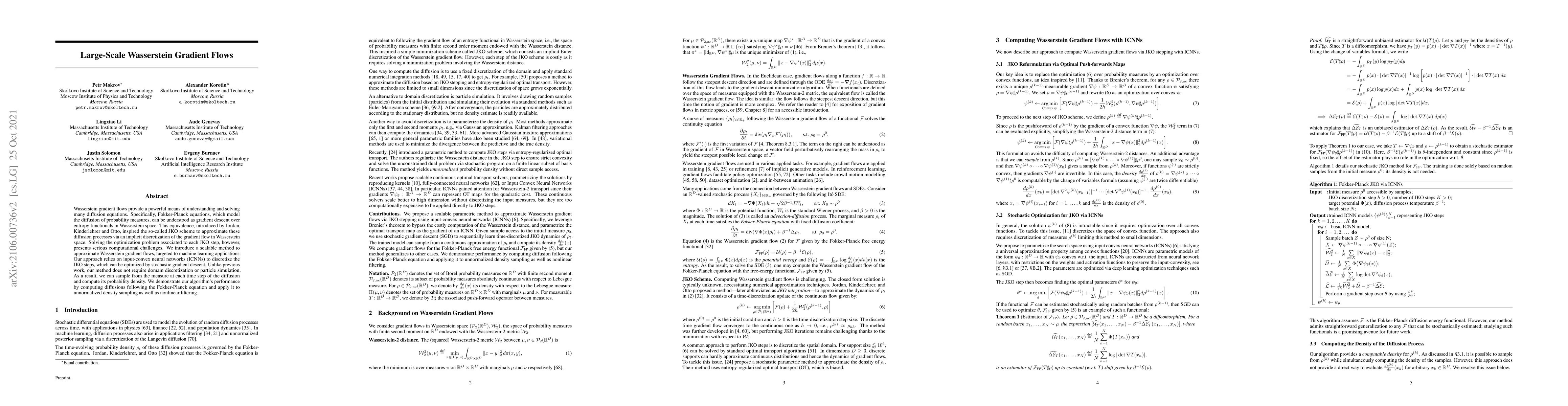This paper introduces a scalable method for approximating Wasserstein gradient flows using input-convex neural networks, enabling efficient computation of Fokker-Planck diffusions without requiring domain discretization or particle simulation, and demonstrating its application in unnormalized density sampling and nonlinear filtering.