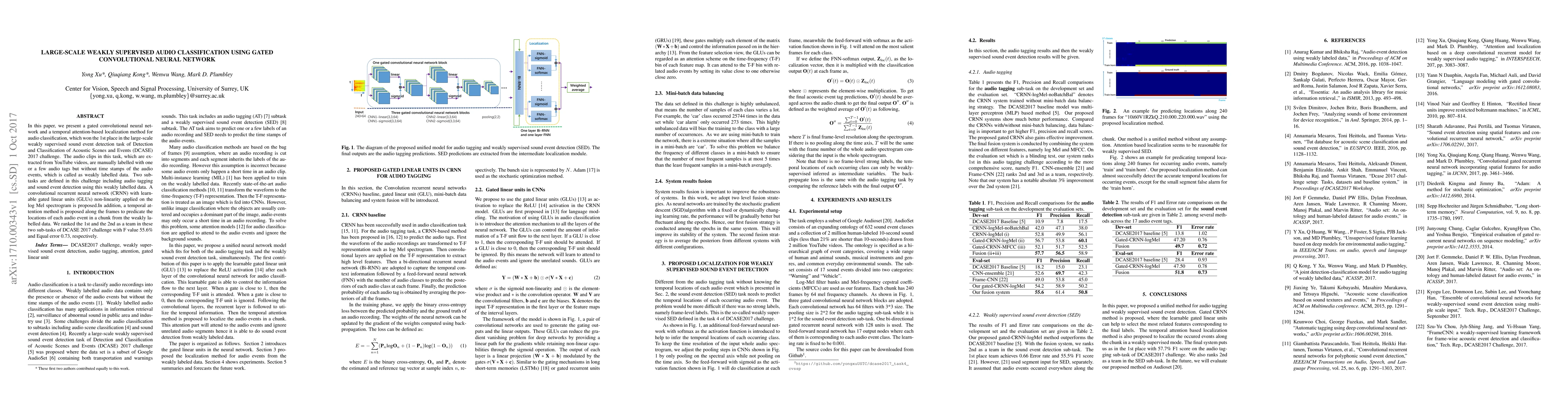 This paper introduces a gated convolutional neural network with a temporal attention method for large-scale weakly supervised audio classification, winning the DCASE 2017 challenge. It effectively classifies audio clips from YouTube videos with minimal labeled data, achieving top ranks in both audio tagging and sound event detection.