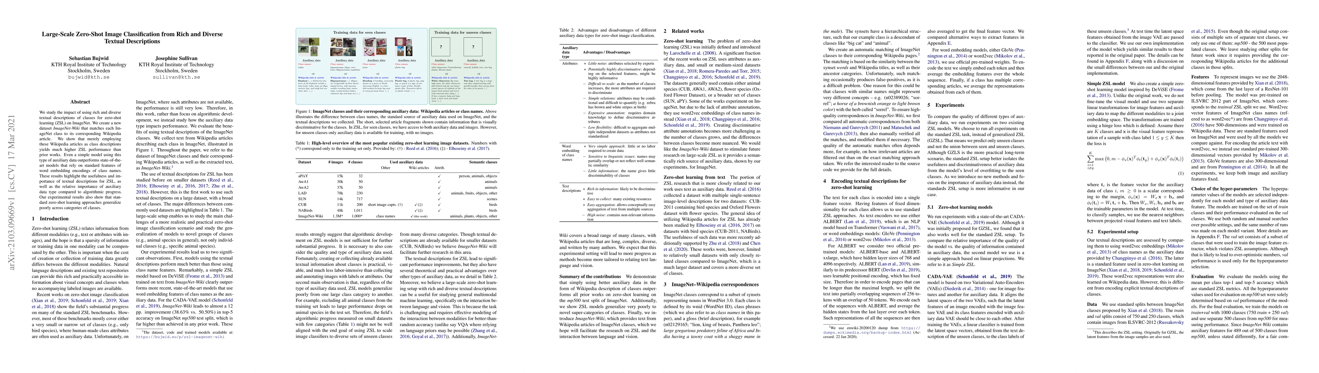 This paper investigates the use of rich and diverse textual descriptions from Wikipedia for zero-shot image classification on ImageNet, demonstrating significant improvements over prior methods. The new ImageNet-Wiki dataset, which pairs ImageNet classes with corresponding Wikipedia articles, shows that textual descriptions outperform standard word embedding encodings, emphasizing the importance of auxiliary data over algorithmic advancements.