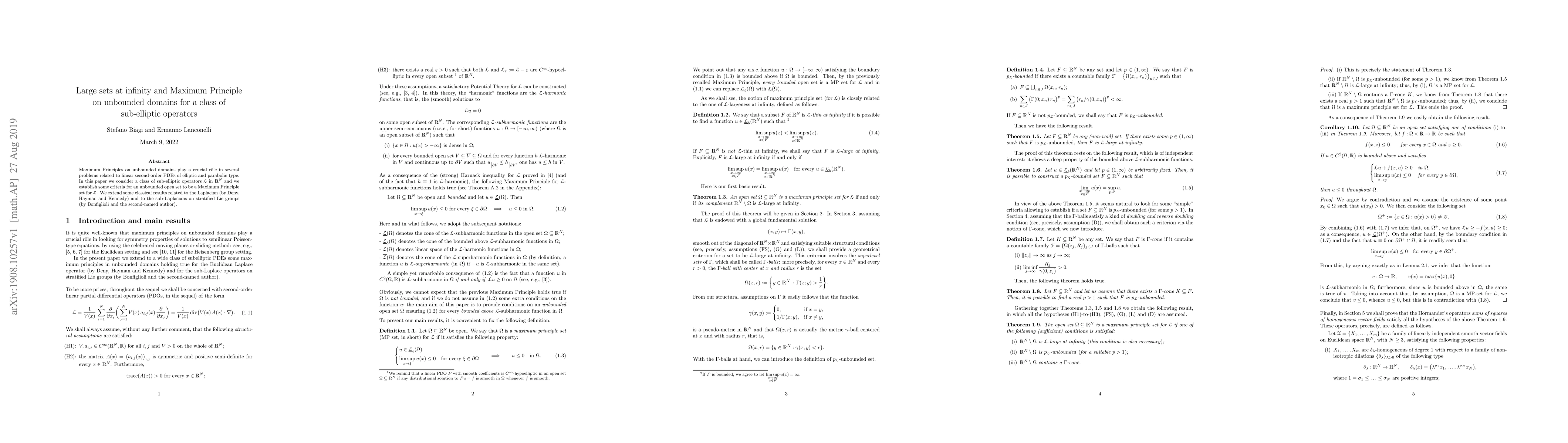 This paper establishes criteria for unbounded open sets to serve as Maximum Principle sets for a class of sub-elliptic operators in $\mathbb{R}^N$. It extends classical results related to the Laplacian and sub-Laplacians on stratified Lie groups.